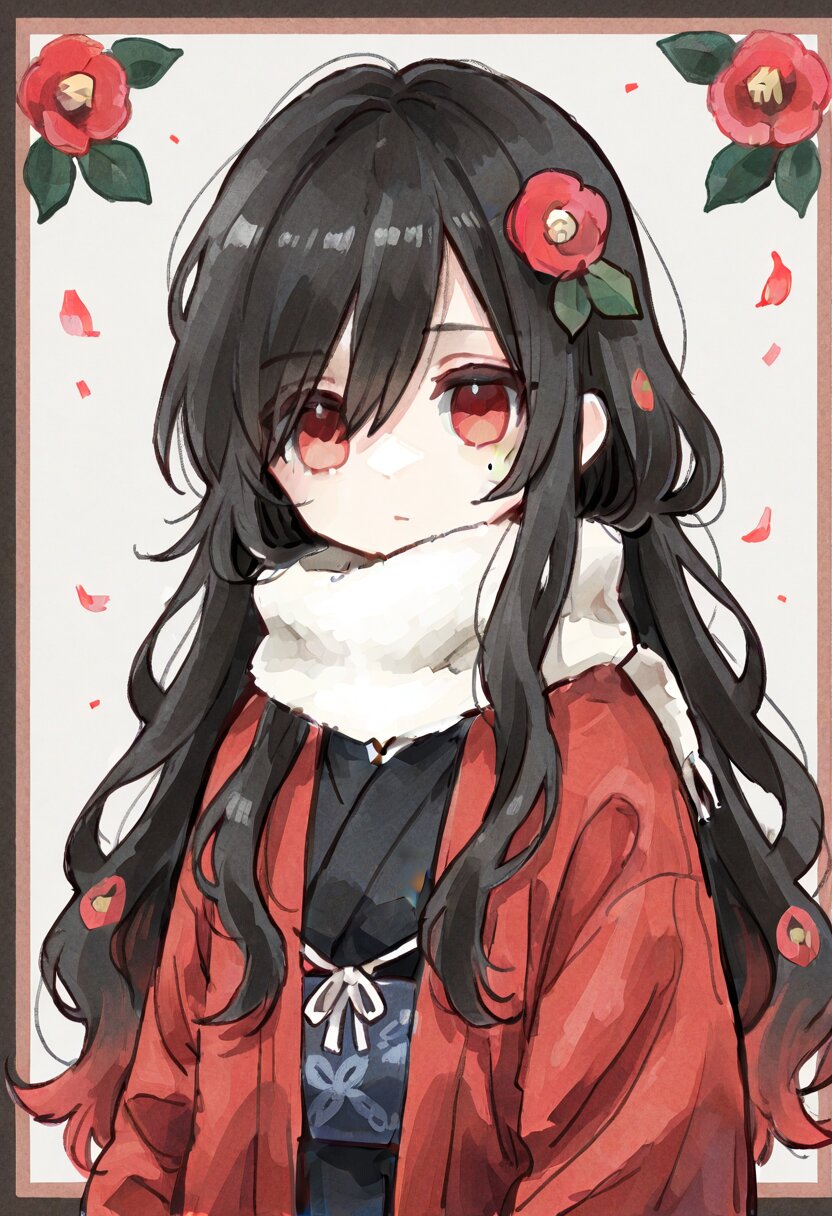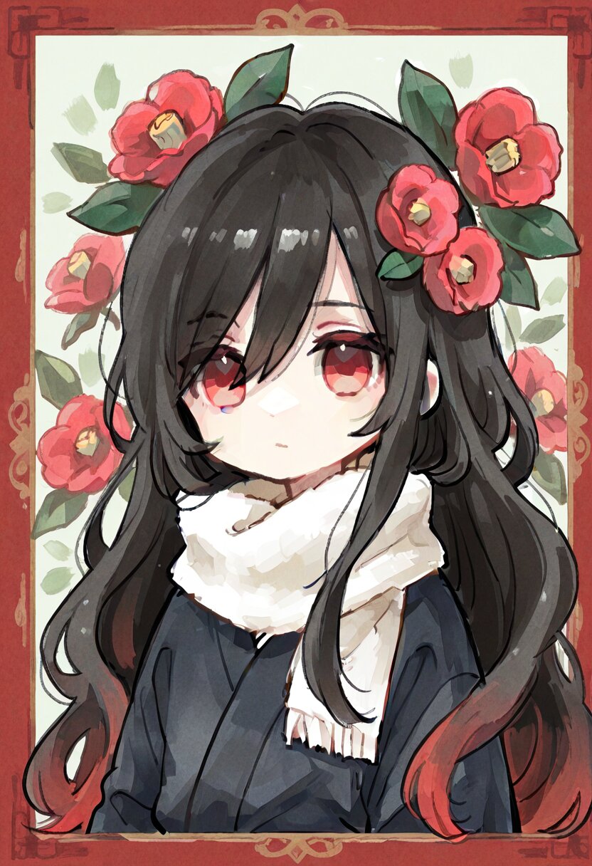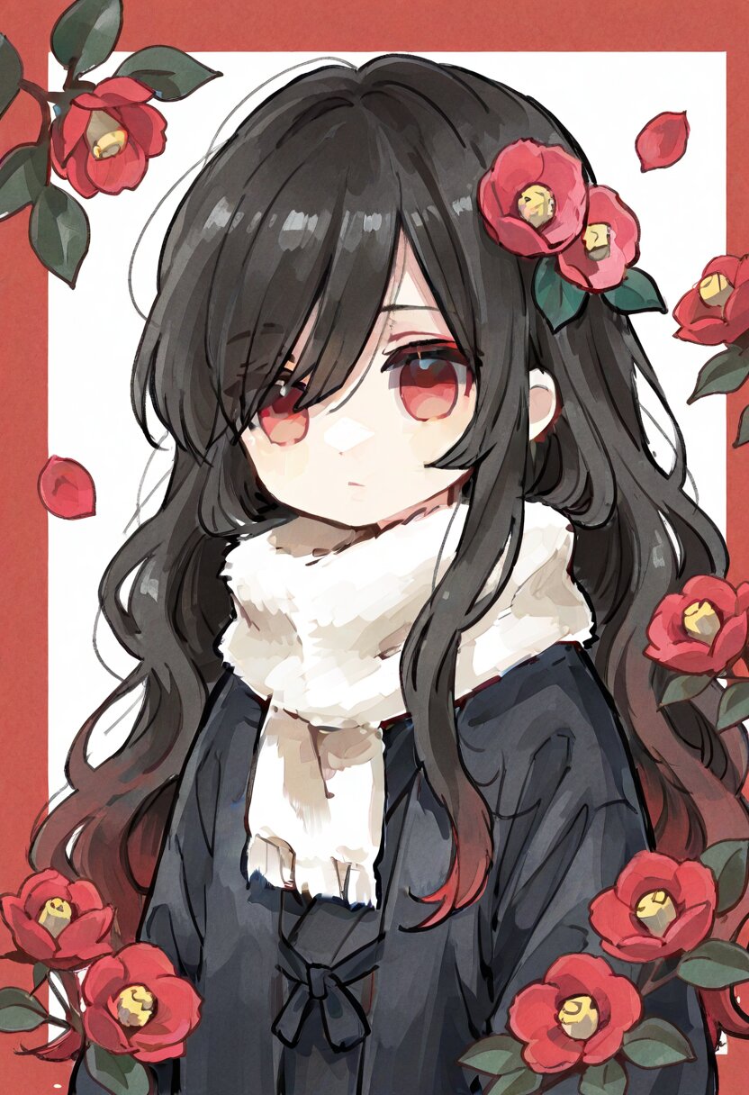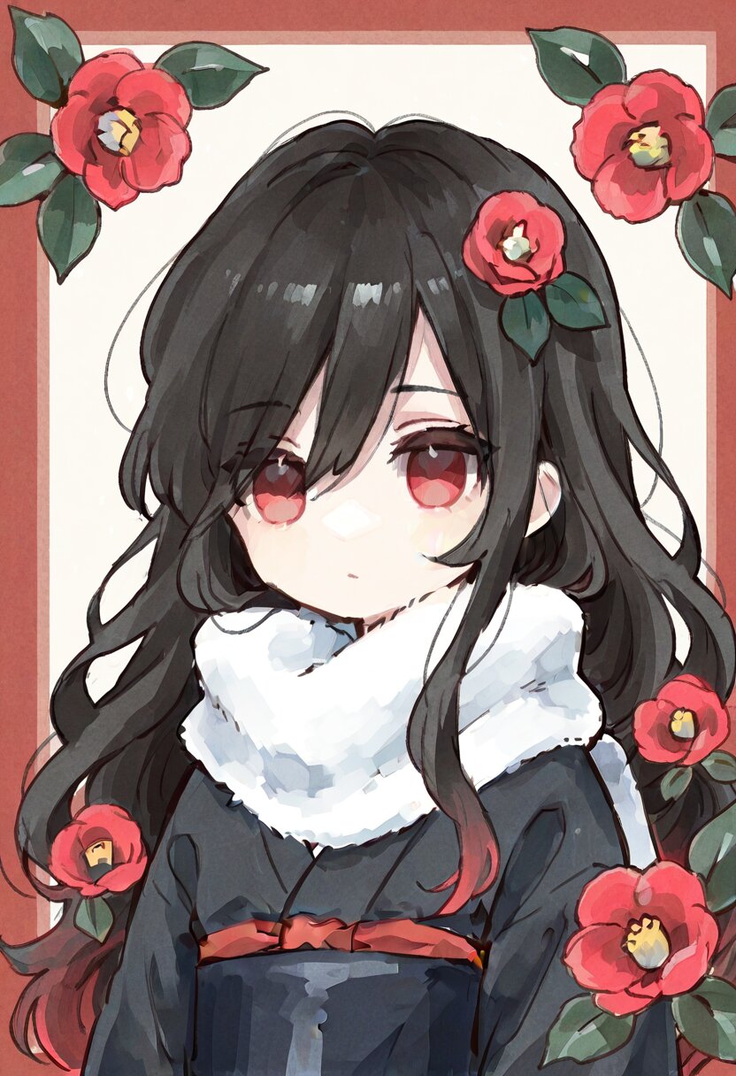 <lora:inmnstyleilxl:0.9>, best quality, masterpiece, very aesthetic, watercolor painting, general, 1girl, chibi, solo, upper body, surrounded camellia, black hair, long hair, wavy hair, long bangs, red colored tips, red eyes, black kimono, white fur scarf, camellia hair ornament, surrounded camellia border