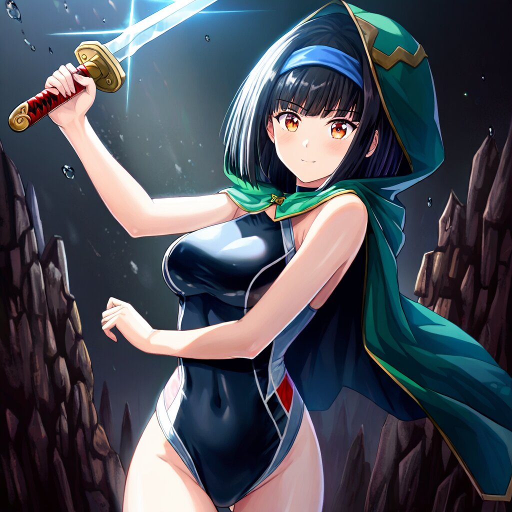 ((masterpiece)), ((best quality)), (ultra-detailed),anime style,a cute girl, large bust, ((Black Racing-style swimsuit)), beautiful black hair, beautiful orange eyes, ((beautiful eyes)),straight hair, (blunt hair), ((blue hairband)), Holding a katana in hand.Facing her, a figure in a deep green hood stands with their back turned, raising their sword. Dark underground cave, stalactites, water droplets