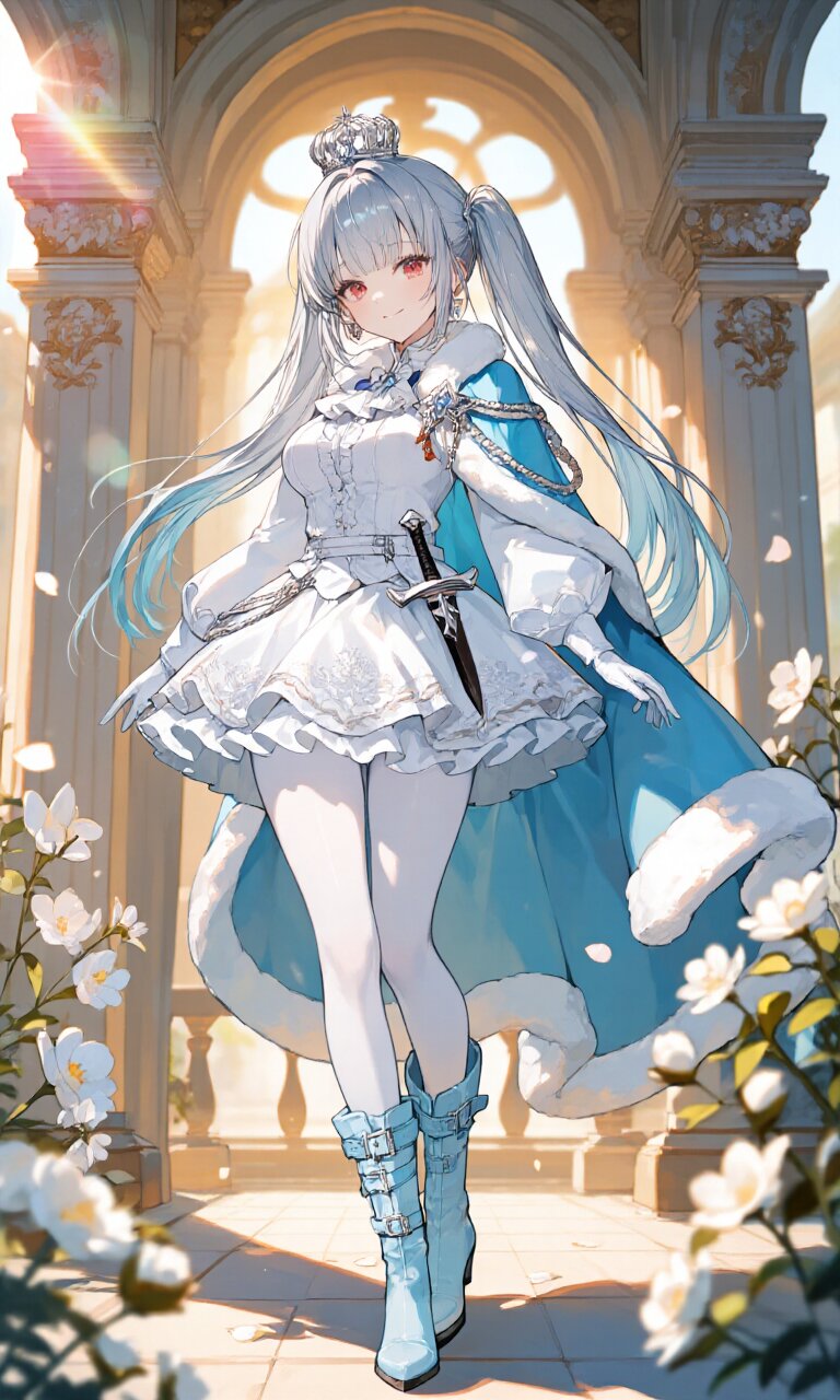 A stunning 24-year-old anime woman stands gracefully in a lavish palace courtyard, her waist-length straight twin-tails cascading in a natural, silvery-blue gradient. Her refined beauty is accentuated by delicate red eyes, flawless skin, and a gentle smile. She wears an opulent (White luxurious Prince costume:1.6) with intricate embroidery, paired with a (Light Blue luxurious Cape:1.3) that billows softly behind her. The ensemble includes a (luxurious mini skirt with White frills:1.4), pristine white tights, and (Light Blue luxurious Boots:1.3) adorned with decorative buckles. A (dagger on waist:1.3) glints at her hip, while a (luxurious crown:1.4) rests atop her head, completing her regal yet playful aesthetic. Her (White gloves:1.2) add a final touch of elegance as she strikes a poised, princely stance. The background features Rococo-style palace architecture with ornate columns, floral motifs, and soft morning sunlight filtering through arched windows. Delicate flowers bloom around her, their petals catching the golden glow, while a subtle lens flare enhances the dreamy atmosphere. The scene exudes romantic academia, blending fantasy grandeur with refined softness. Every detail—from the embroidery on her sleeves to the strands of her shimmering hair—is rendered in hyper-detailed, 16k clarity, emphasizing her ethereal charm.