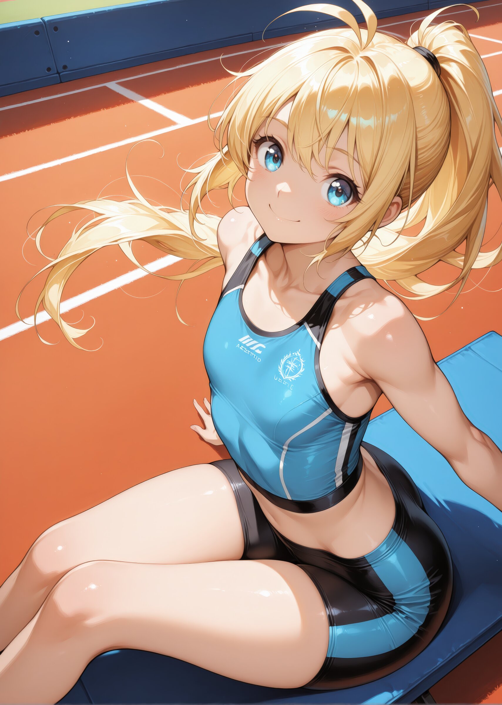 masterpiece, best quality, beautiful and aestheti, professional illustrasion, ultra detail, extremely detailed, highest detailed, absurdres, highres, colorfull, intricate, anime style illustration, 1girl, (young girl), small body, beautiful face and eyes, Beautiful, clear, curious blue eyes, Beautiful hair, floating hair, shoulder length hair, (blonde hair), bobbed hair with ponytail, antenna hair, ahoge, pretty, (flat chest), (small breasts), active personality, sportswear, athlete, biceps, big smile, bike shorts, sitting , leaning back with both hands behind, legs stretched out in front, head slightly tilted back, dutch angle, from above, from side, looking at viewer