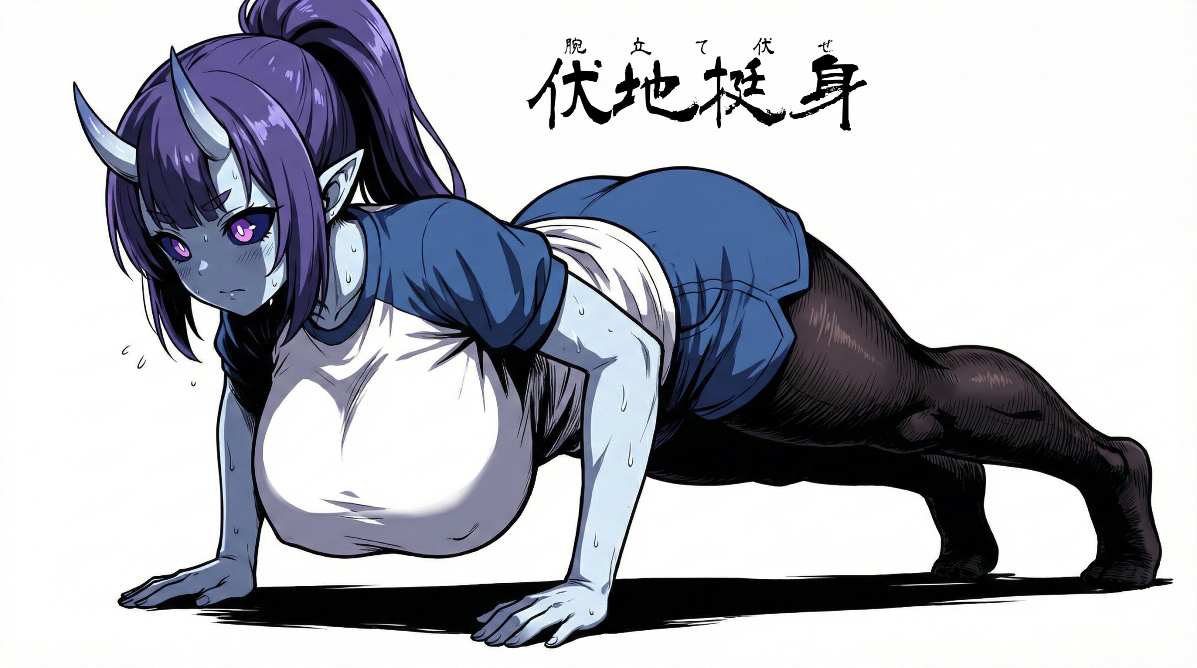 イラストのキャラクターをGペンでペン入れする。2D。カラー。強めの影とコントラスト。線は細く薄くする。フラット。胸と太腿がとても豊満。腰が細い。背が低い。キャラクターの特徴をそのままに、ポーズを完全に変更。黒タイツの質感向上。キャラクターは強膜が紺色、瞳が紫色、瞳孔が白い。背景は白。キャラクターが腕立て伏せをしている横長方形イラストを生成。