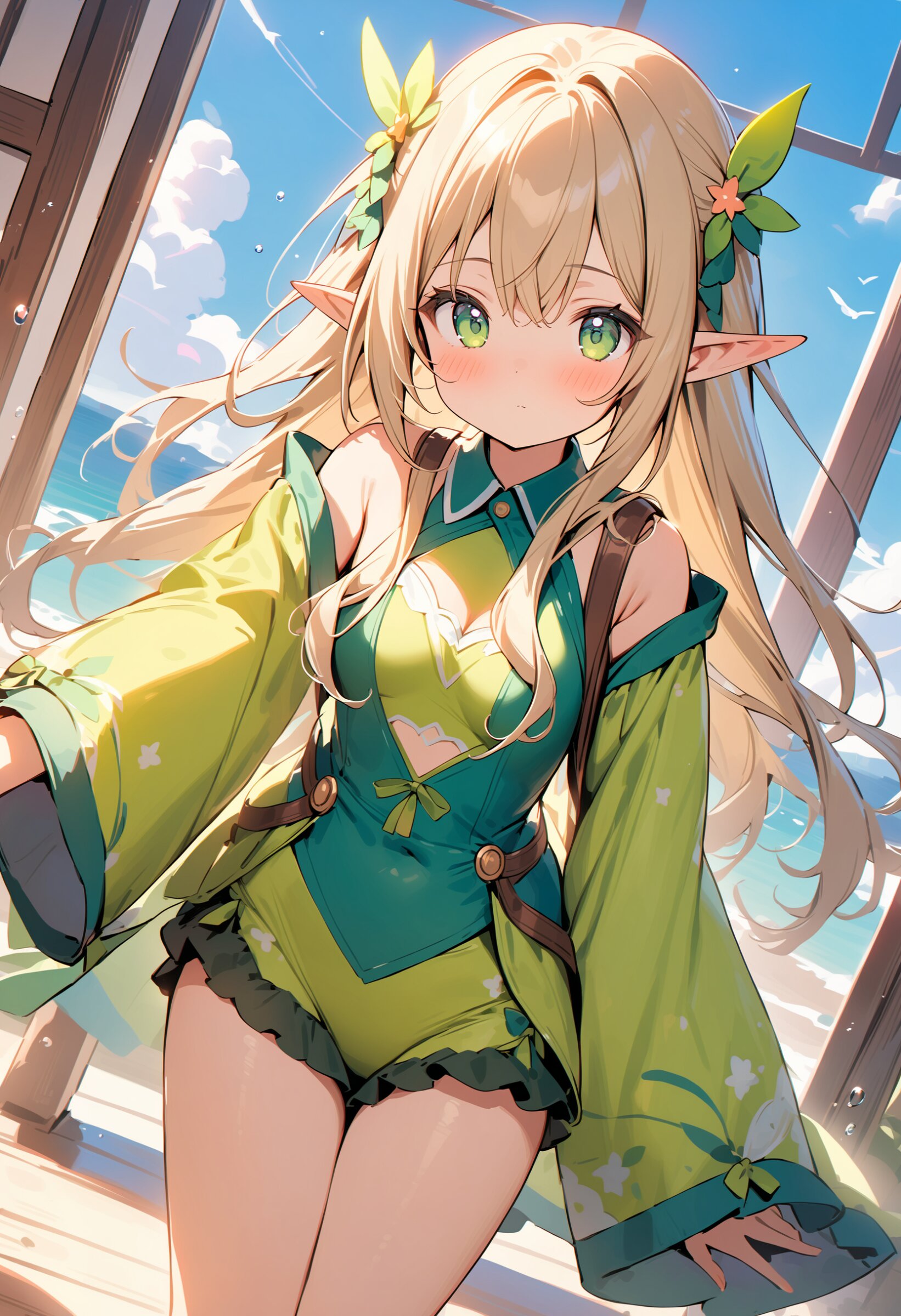 ((masterpiece)), ((best quality)), ((kawaii)), cute, (lovely), ((extremely detailed)), (beautiful), dynamic angle, a cute girl, 1girl, solo, ((elf )),beautiful blond hair, beautiful green eyes, ((beautiful eyes)), long hair, fantasy clothes,