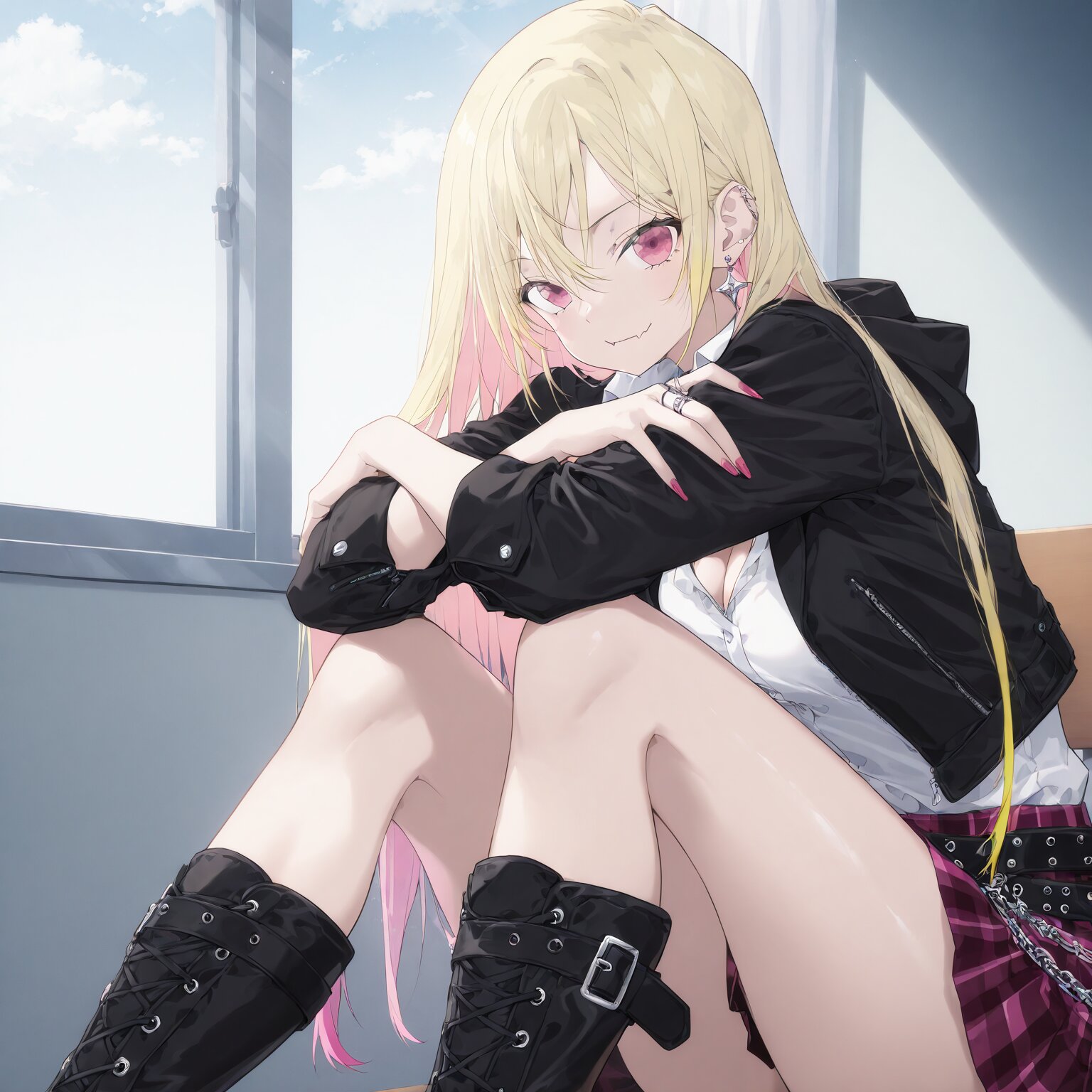 (1girl), young female, BREAK, (((blond long hair, Straight Hair:1.7))), ((sharp bangs:1.5 )),((Long sideburns)),(((red eyes))), (slanted eyes), slender, (sweat:0.8), shiny body, shiny skin, (full breasts:1.3), Tight, tight waist, toned body, (muscular abs, abs:0.8), muscular BREAK, ((diamond-shaped earrings)), chain belts, chains, chain accessories, ring, (((pink inner hair, gradient hair from blond to pink:2))), ((skin fangs)), BREAK, Slender, narrow waist, toned body, athletic body, shiny skin, Highlights, beautiful eyes, beautiful pupils, Long nails, red nail polish, gorgeous nail polish, BREAK, ((School uniform:1.2)), white shirt, dress shirt, rolled up sleeves, cleavage, miniskirt, BREAK, black hoodie jacket, open jacket, leather boots arms crossed BREAK, ((newest, anime, animation, anime screen capture, anime style:1.3)) BREAK, ((masterpiece, , vibrant, very aesthetic, highly detailed, best quality, 16k:1.3)) (perfect fingers:1.2)