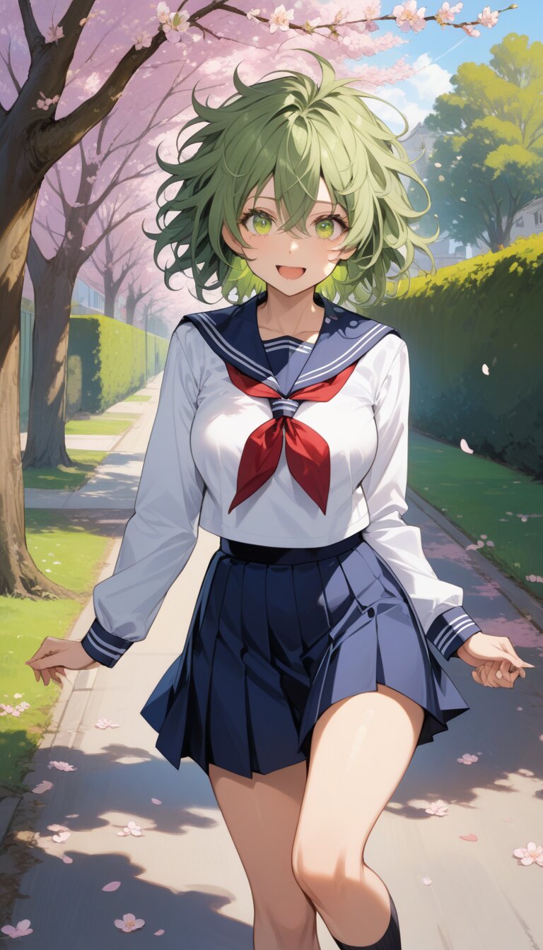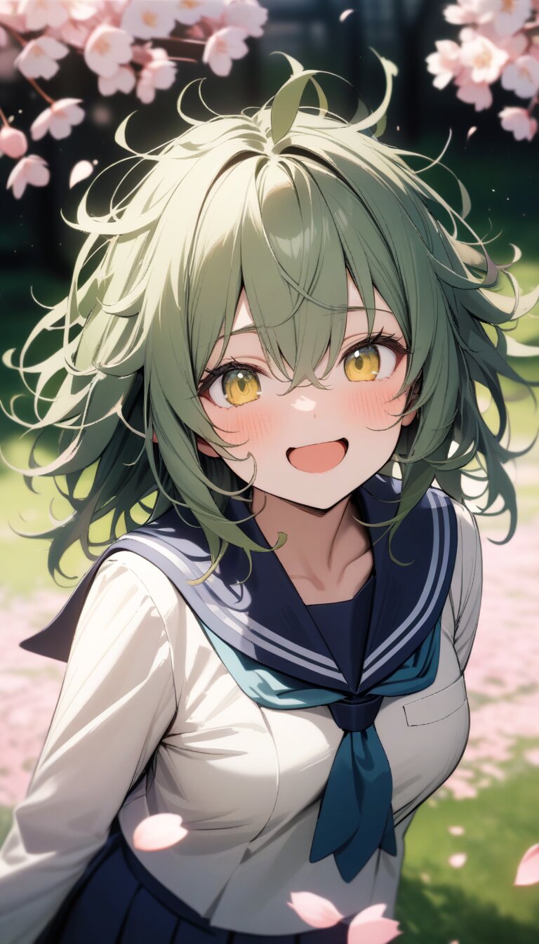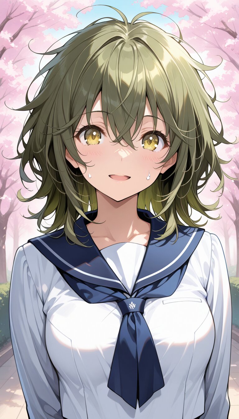 masterpiece,best quality,amazing quality,general, fine detail, official art, 1girl, cute face, Female high school student wearing (navy sailor school uniform:1.5), (messy hair:1.5), medium hair, olive-green hair, large expressive yellow-green eyes, flushed cheeks, slightly open mouth, medium breasts, hair between eyes, (beautiful eyes), scattered cherry blossoms in the background, masterpiece, best quality, {{{{masterpiece}}}}, {{{{school uniform}}}}, light smile,