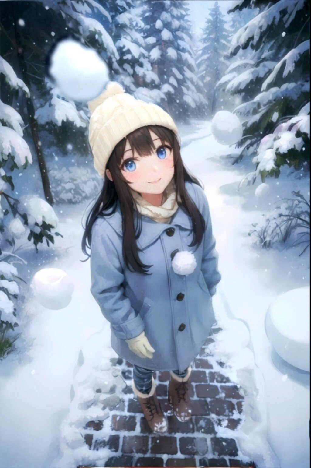 An anime-style girl is walking along a snowy forest path. She is wearing a cream-colored knit cap and scarf, a light blue coat, gloves, and boots. She has brown hair and large blue eyes. Her face is slightly flushed and she is smiling gently. Her gaze is slightly tilted upward, as if looking up at the viewer. Snow-capped trees grow on both sides of the path, and snowflakes are falling. The illustration has an overall bright, warm, and soft atmosphere, with delicate depictions of snowflakes and light. Ultra high definition, 4K, masterpiece, top quality, detailed background, contrast of light and shadow