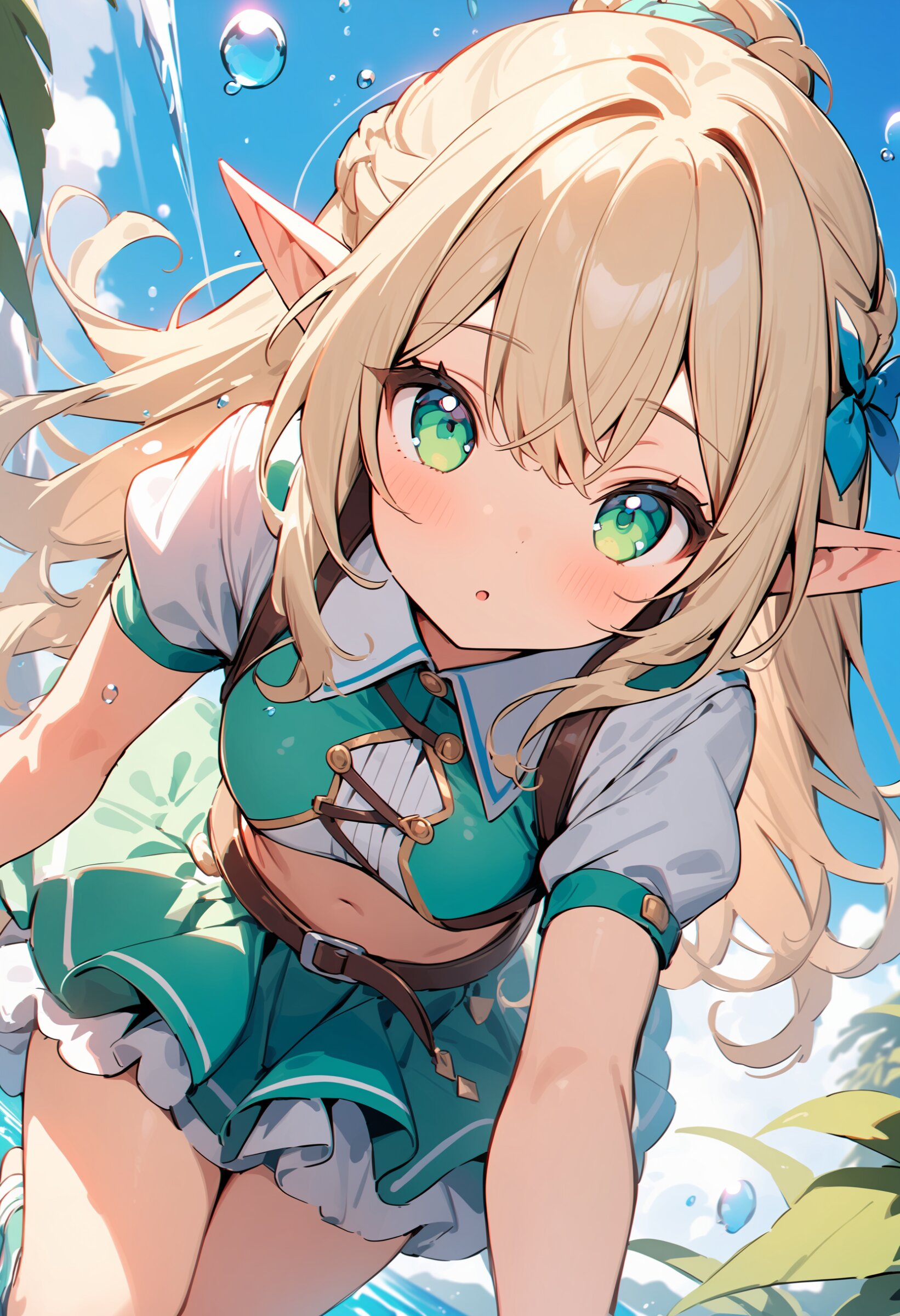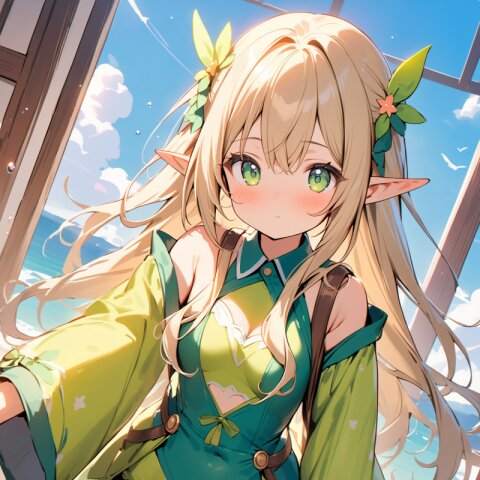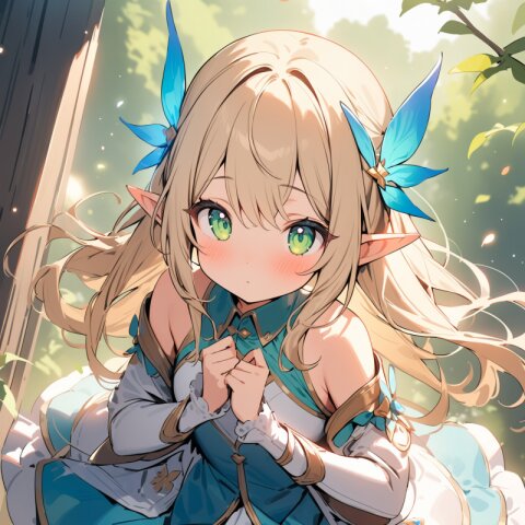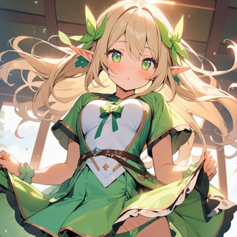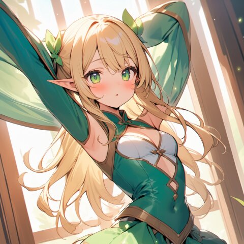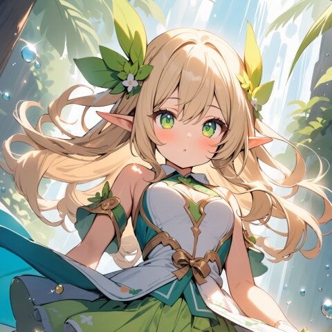 ((masterpiece)), ((best quality)), ((kawaii)), cute, (lovely), ((extremely detailed)), (beautiful), dynamic angle, a cute girl, 1girl, solo, ((elf )),beautiful blond hair, beautiful green eyes, ((beautiful eyes)), long hair, fantasy clothes,