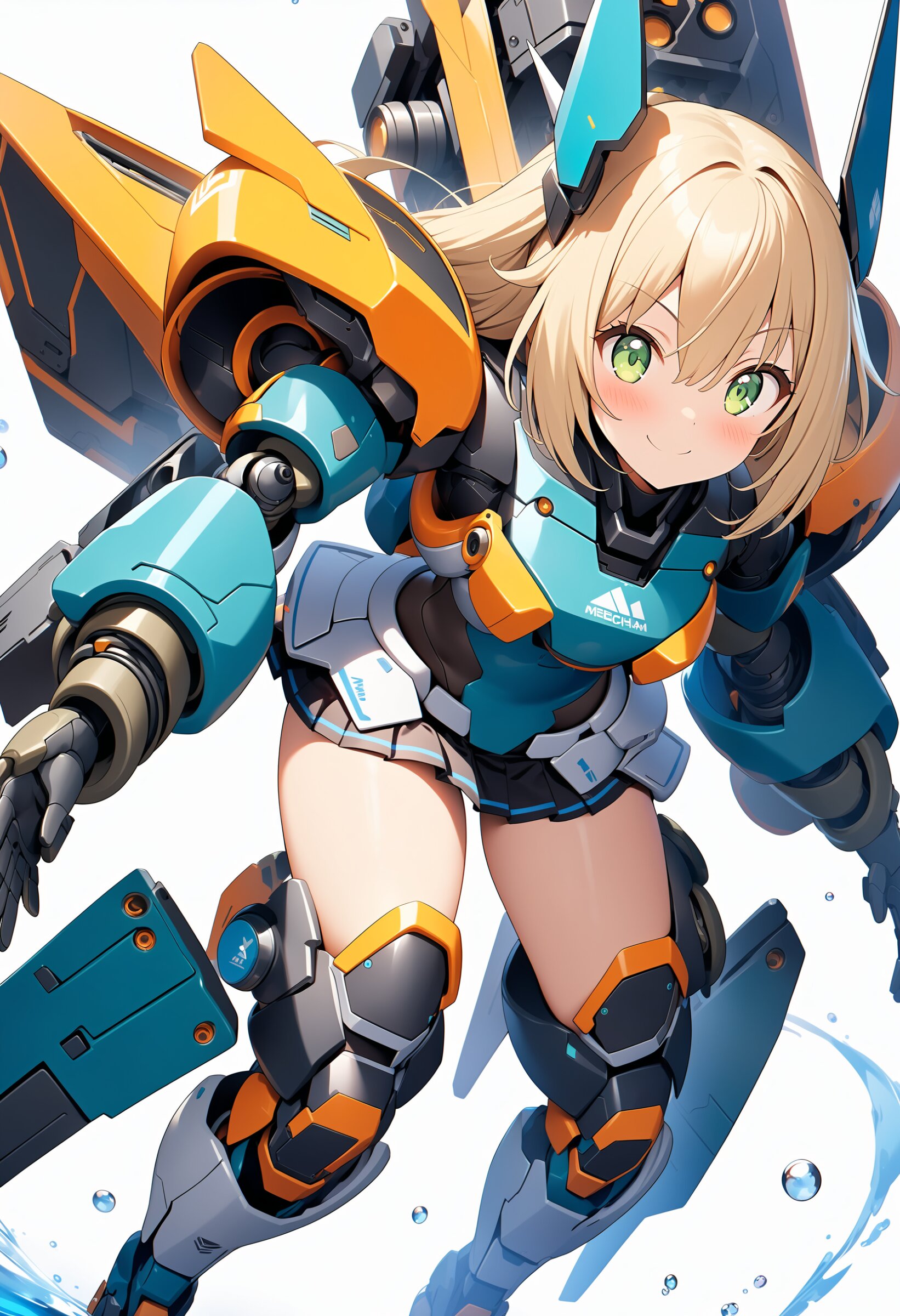 1girl, ((white background)), ultra detailed 8k cg render, masterpiece, high resolution, extremely detailed, mecha musume,mecha shoulder, mech leg, headgear, mecha armor, ((mini skirt)),long blonde hair, dropping green eyes, smile, dynamic posing,
