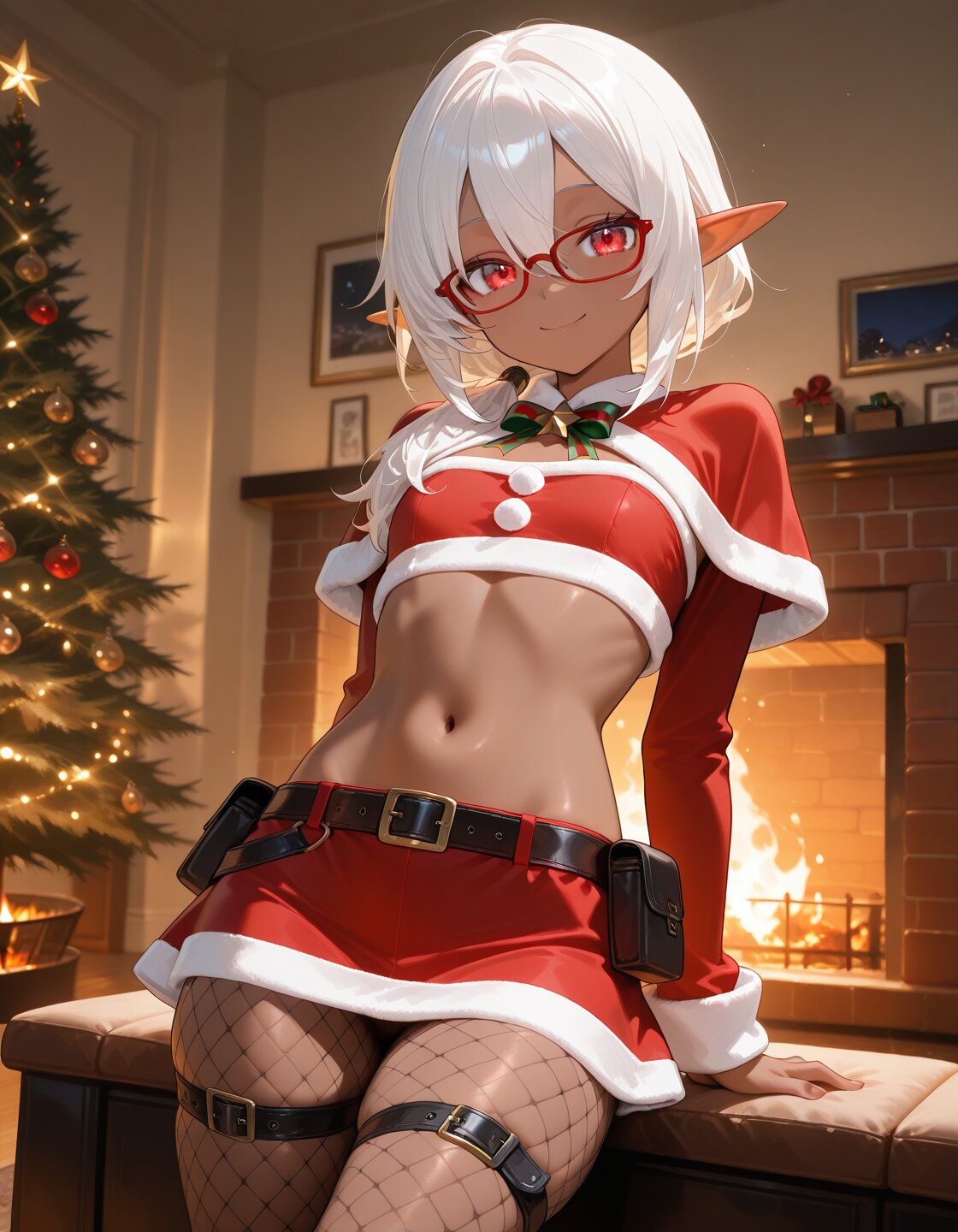 1girl, sensitive, christmas, (beautiful eyes, detailed eyes), looking at viewer, solo, cute, santa costume, living room, fireplace, christmas tree, night, (dark skin, red-framed eyewear:1.2), white hair, low ponytail, medium hair, hair between eyes, hair over shoulder, flat chest, red eyes, elf, midriff, navel, mini skirt, belt pouch, utility belt, thigh belt, fishnet pantyhose, smile, masterpiece, best quality, amazing quality,