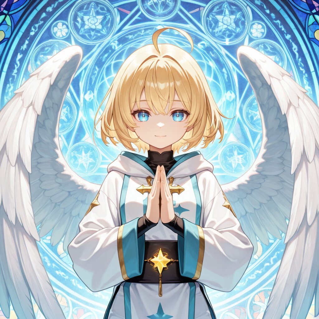 masterpiece,best quality,highres,highly detailed,detailed eyes,general,1girl,solo,17 years old,(very large white wings down and round fold,join palms together, praying,shining aura,holy aura background,shining holy magic circle back ground,upper body:1.2),cute girl,slender,small breasts,Very long sleeves that cover the wrists,(ahoge, blonde hair, short hair, blue eyes),light smile,closed mouth,(priestess,white clothes, very long white robe,very long white tabard, long white pants, hood down, Star pendant, obi),boots,slender girl,standing,Very beautiful large stained glass in a very beautiful church,fantasy,