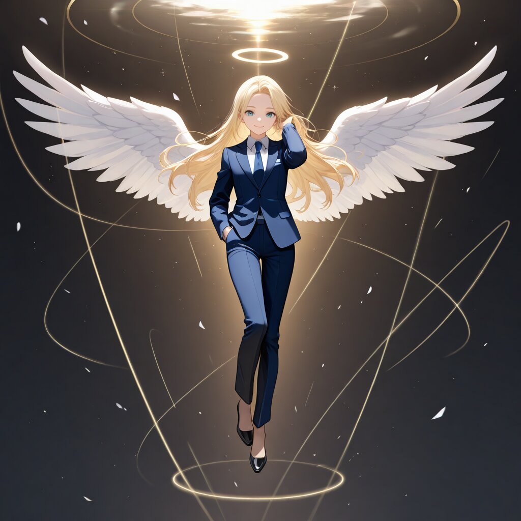 masterpiece,best quality,highres,highly detailed,general,1girl,solo,angel,angel wings,halo,smile,suit,necktie,long pants,zero gravity,full body, BREAK hand in pocket,hand in own hair,fantasy