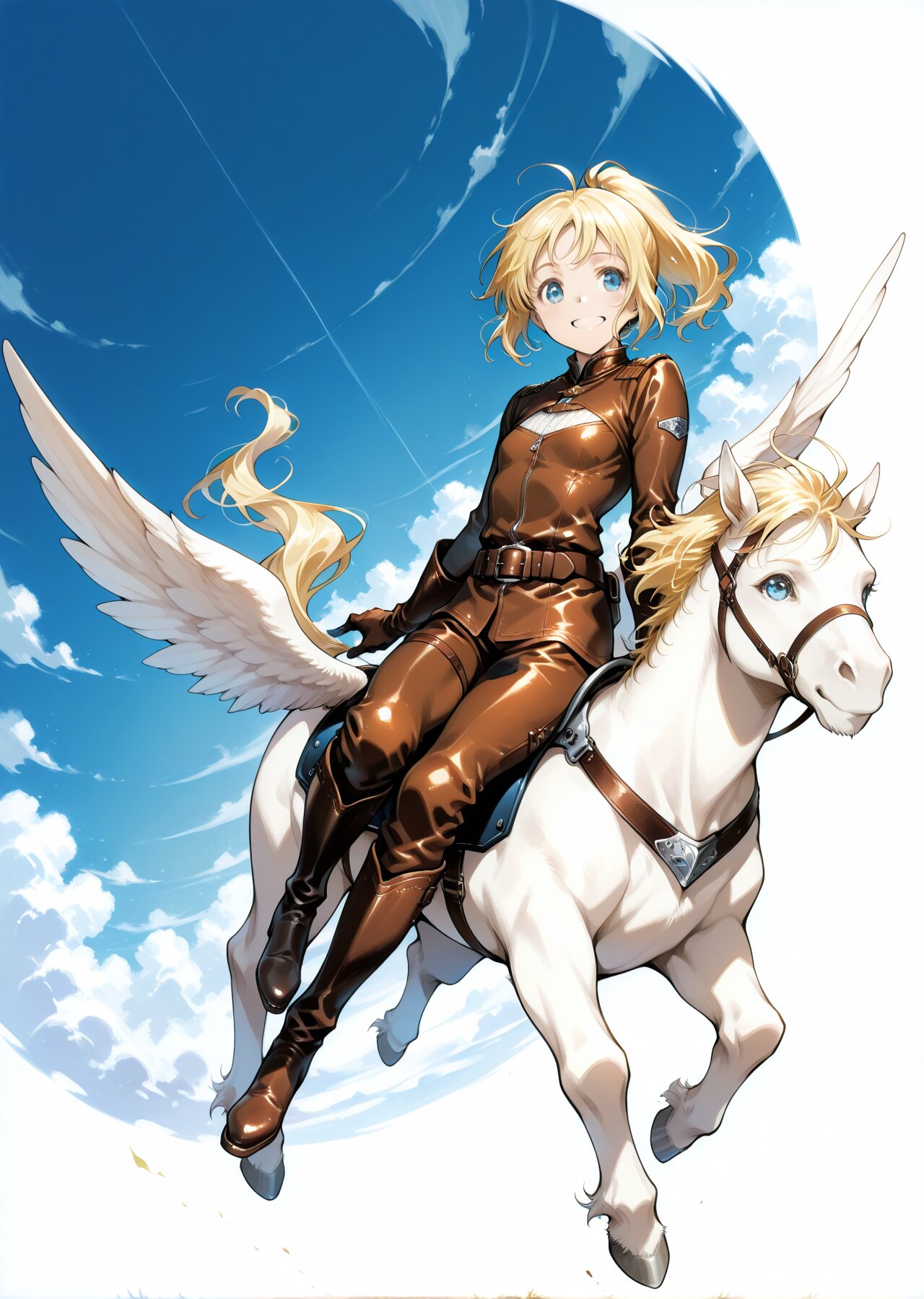 Best quality, Masterpieces, simple background, negative space, anime-style illustration, white background, fine detail, 1girl, (young girl), small body, beautiful face and eyes, Beautiful, clear, curious blue eyes, Beautiful hair, floating hair, shoulder length hair, (blonde hair), bobbed hair with ponytail, antenna hair, ahoge, pretty, (flat chest), (small breasts), active personality, big smile, riding white pegasus, (brown leather clothes:1.3), full armor, leather gloves, leather belt with porch, leather boots, dynamic pose, cinematic angle, blue sky, flying, no humans, soft cloudy sky background, light blue and white, minimal and dreamy