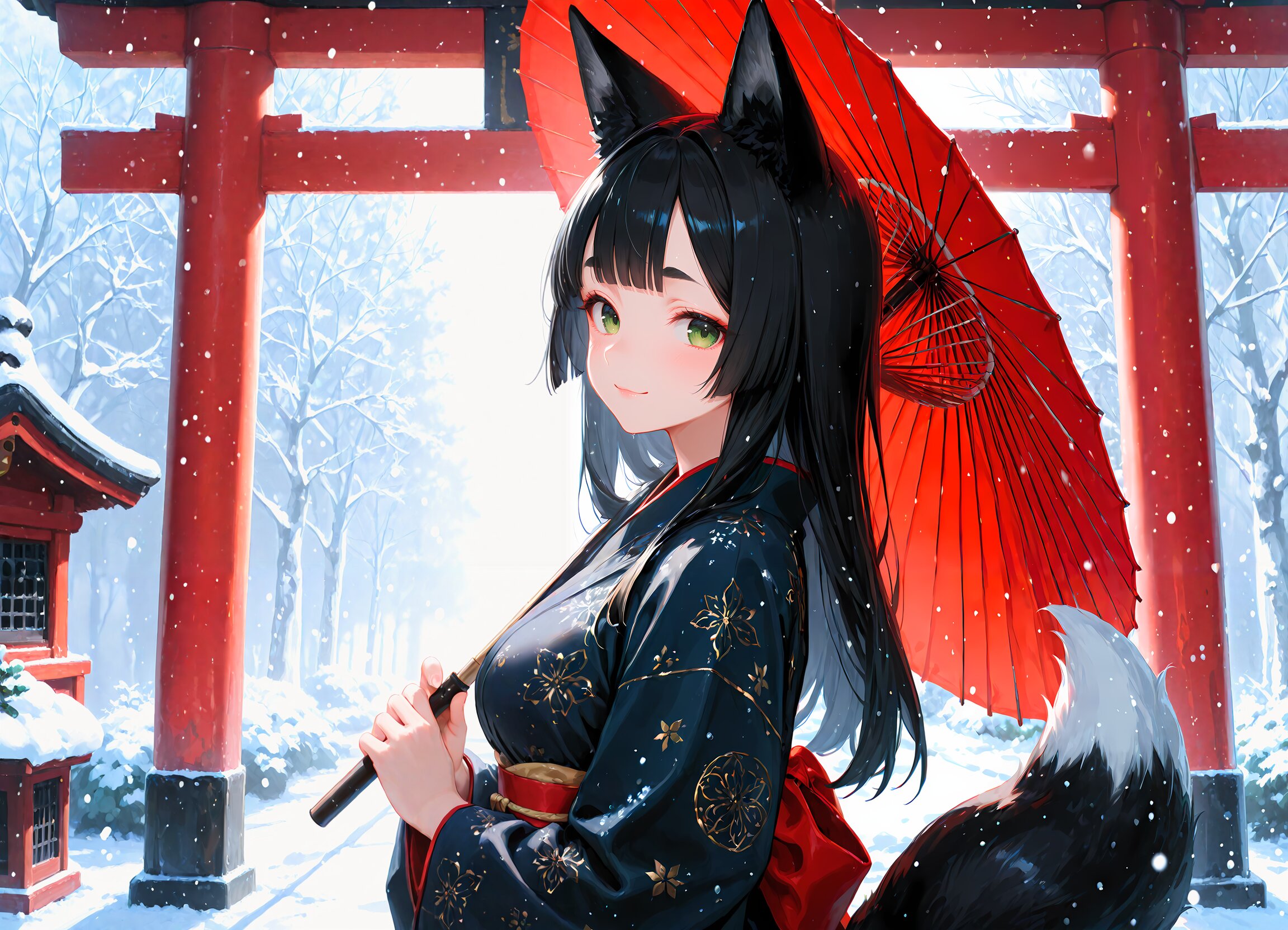 general,winter,torii,snowing,from side,upper body, 1girl,solo,traditional Japanese clothes,wearing a traditional kimono with intricate patterns,holding umbrella,from side,reaching reaching toward snow, looking at viewer,seductive smile, BREAK fox girl,black hair,long hair,black fox ears,black fox tail,blunt bangs,tareme,green eyes,blush, hikimayu,short eyebrows,thick eyebrows, medium breasts, BREAK Particles of light,complex,Natural Light,Attention to detail,Movie Scenes,<lora:xl_more_art-full_v1:0.6>,<lora:great_lighting:0.6>,<lora:flat_sdxl:-0.4>,<lora:outline_xl_kohaku_delta_spv5x:-0.4>,<lora:Detailer_NoobAI_Incrs_v1:0.8>,detailed,, appropriate posture,appropriate configuration,ideal ratio body proportions,perfect anatomy, <lora:Fixhands_anime_bdsqlsz_V1:1>, masterpiece,best quality,newest,absurdres,highres,ultra high res,8K UHD,hyper-detailed,, appropriate posture,appropriate configuration,ideal ratio body proportions,perfect anatomy, <lora:Fixhands_anime_bdsqlsz_V1:1>, masterpiece,best quality,newest,absurdres,highres,ultra high res,8K UHD,hyper-detailed,, appropriate posture,appropriate configuration,ideal ratio body proportions,perfect anatomy, <lora:Fixhands_anime_bdsqlsz_V1:1>, masterpiece,best quality,newest,absurdres,highres,ultra high res,8K UHD,hyper-detailed,, appropriate posture,appropriate configuration,ideal ratio body proportions,perfect anatomy, <lora:Fixhands_anime_bdsqlsz_V1:1>, masterpiece,best quality,newest,absurdres,highres,ultra high res,8K UHD,hyper-detailed,, appropriate posture,appropriate configuration,ideal ratio body proportions,perfect anatomy, <lora:Fixhands_anime_bdsqlsz_V1:1>, masterpiece,best quality,newest,absurdres,highres,ultra high res,8K UHD,hyper-detailed,, appropriate posture,appropriate configuration,ideal ratio body proportions,perfect anatomy, <lora:Fixhands_anime_bdsqlsz_V1:1>, masterpiece,best quality,newest,absurdres,highres,ultra high res,8K UHD,hyper-detailed,