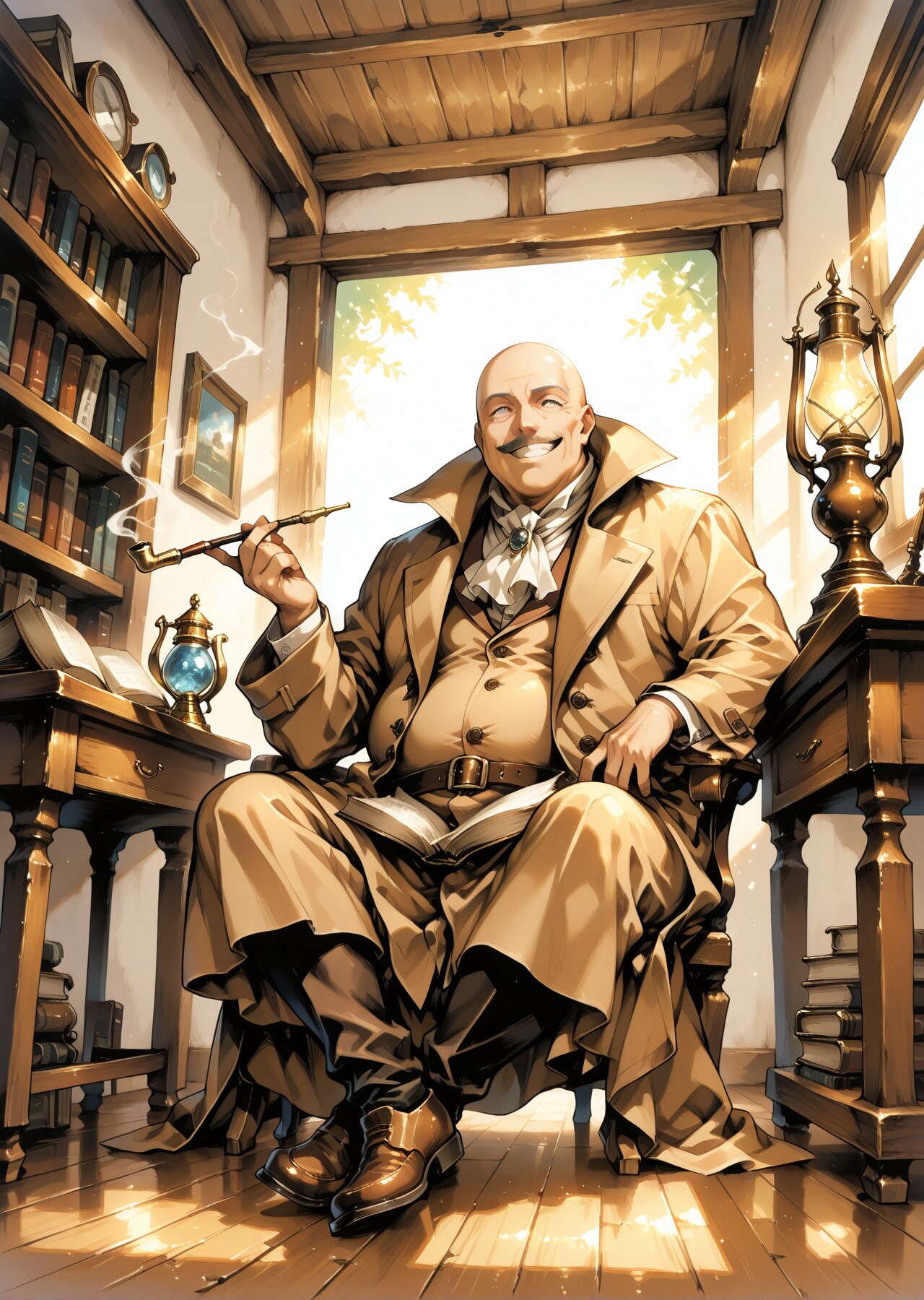 masterpiece, best quality, official art, a white background with a minimalist design, negative space, anime-style illustration, adventurous spirit, great part of the story, solo, 1boy, middle-aged man, Fat, Bald head, mustache, detective, ((Long coat lined) with pockets) for (storing crafting tools), grin, Sitting cross-legged, holding smoking pipe, dynamic pose, cinematic angle, An opulent study with floor-to-ceiling bookshelves housing an extensive collection of leather-bound books. A mahogany desk sits at the room's center, adorned with antique globes and a brass reading lamp. Sunlight filters