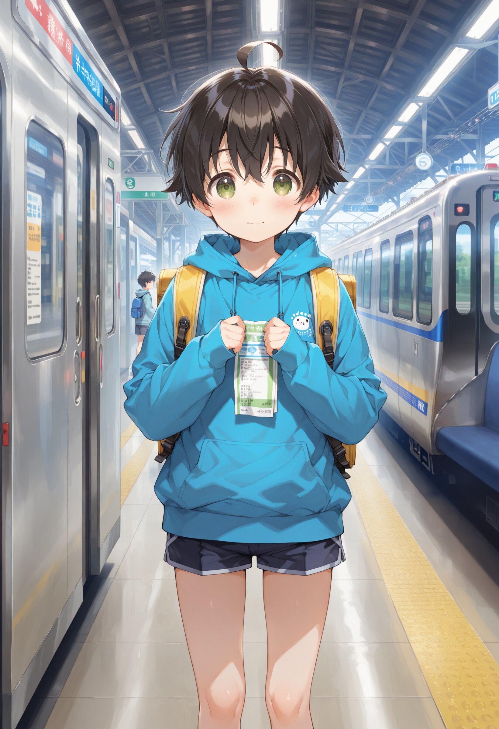 masterpiece, best quality, amazing quality, general, fine detail, official art, 1boy, kawaii, shota, ahoge, hoodie, short pants, long sleeves, moe sode, Sleeves past wrists, (Hold the train ticket:1.2), station, ticket gate, Carry a small cloth backpack, innocent expression,