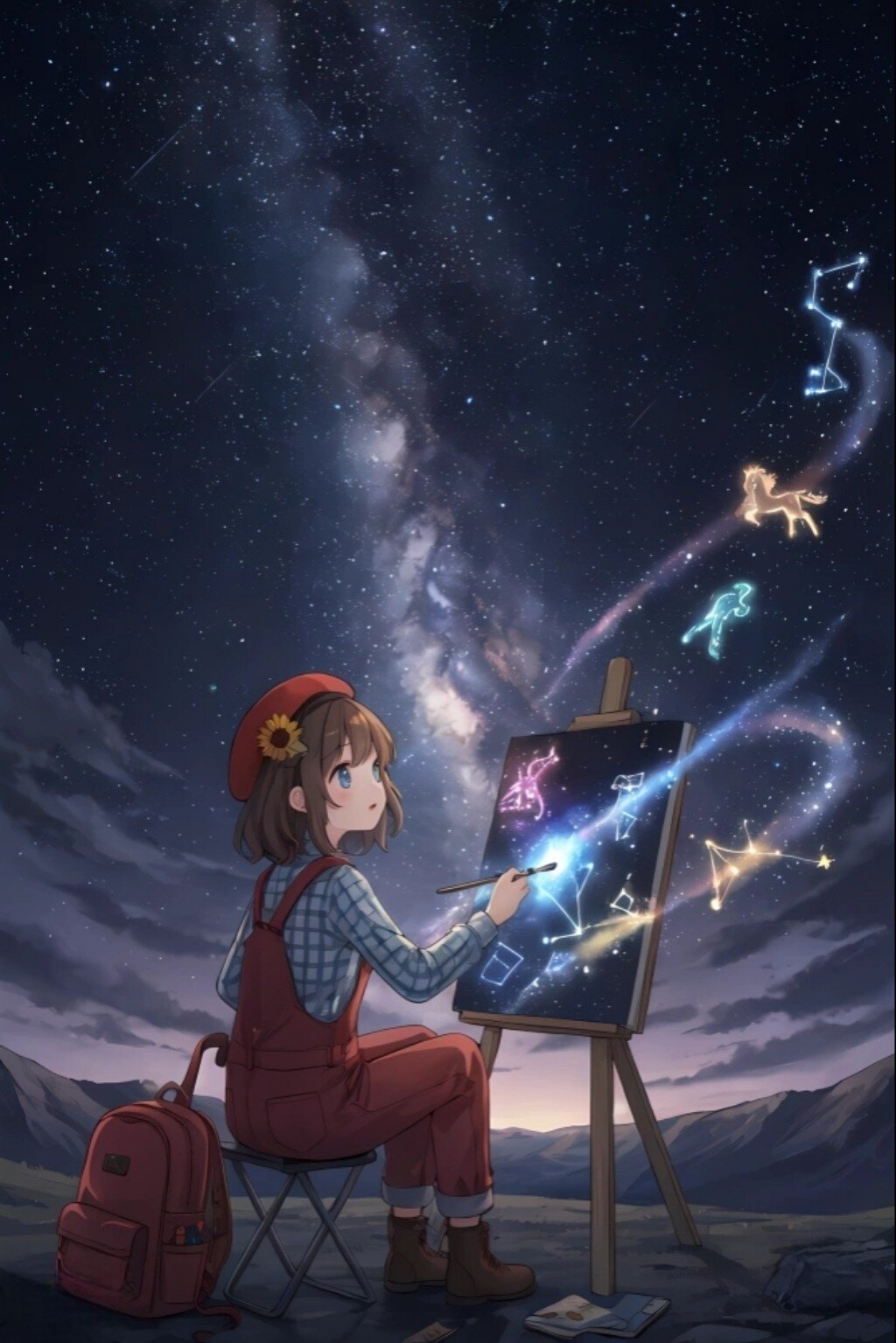 An anime-style illustration of a cute girl, Himawari-sensei, who is an artist and illustrator. She has brown hair, blue eyes with freckles, and wears a beret, overalls, and boots. She is sitting on a folding chair in a natural, open landscape, looking up at a breathtaking night sky filled with countless sparkling stars and the Milky Way. She is painting on an easel, depicting the constellations that swirl magically from her canvas into the night sky, forming fantastical stories. Her red backpack is placed beside her. The overall atmosphere is dreamlike and mystical, with a sense of wonder and artistic creation under the vast celestial dome