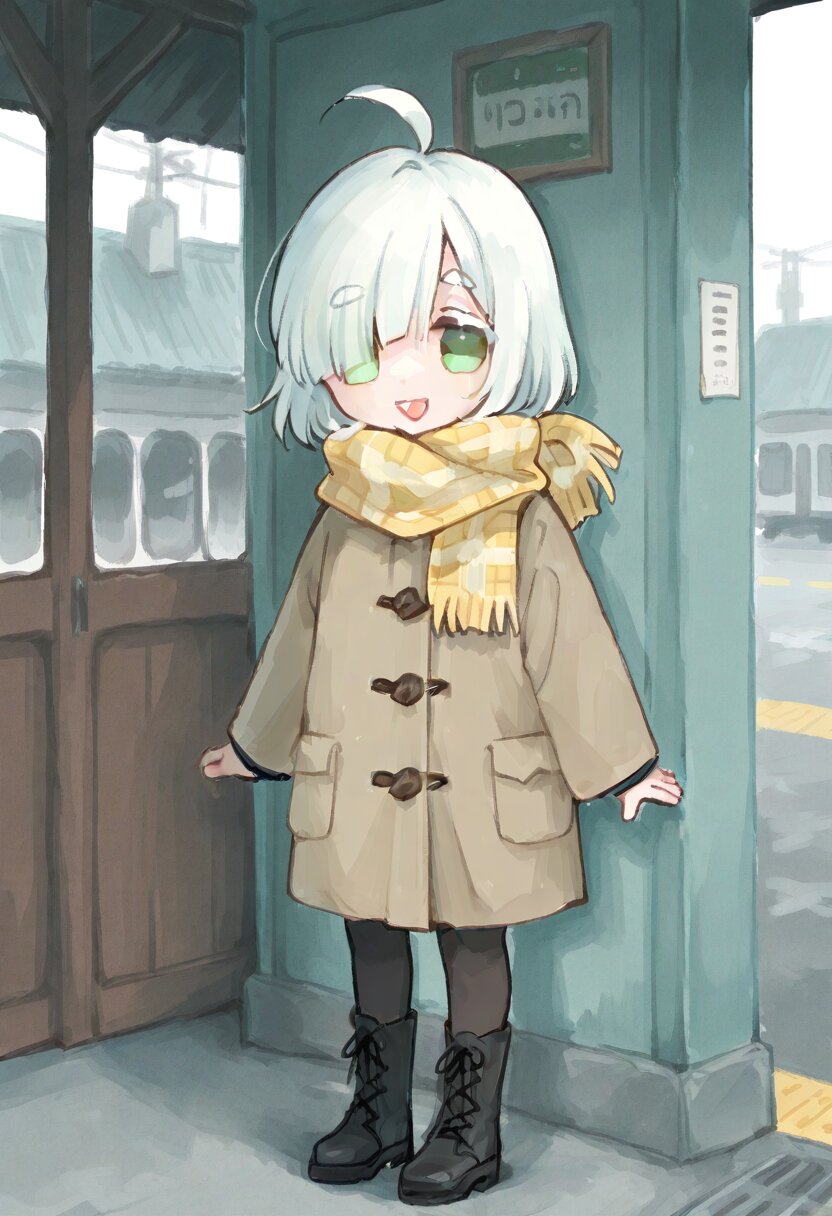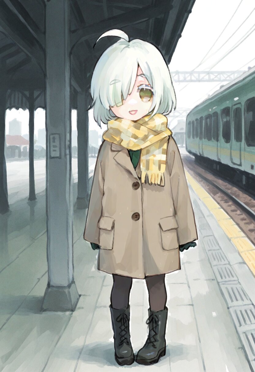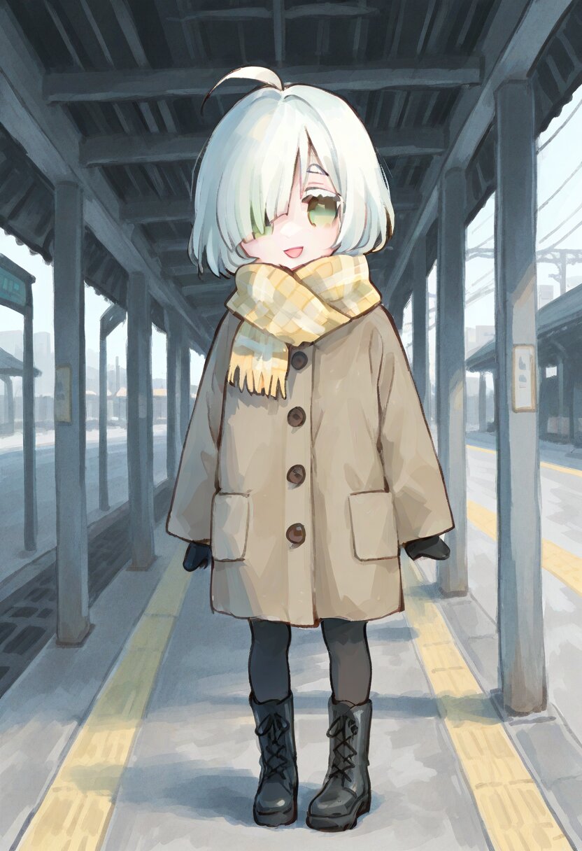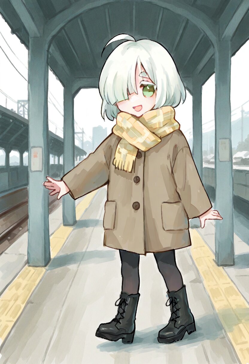 <lora:inmnstyleilxl:0.9>, best quality, masterpiece, very aesthetic, watercolor painting, general, 1girl, chibi, solo, station, (bright white hair), short hair, blunt bangs, white thick eyebrow, white colored eyelashes, (hair over one eye), ahoge, mint green eyes, oversize brown coat, yellow plaid scarf, black tights, black lace-up boots, smile, open mouth, looking at viewer