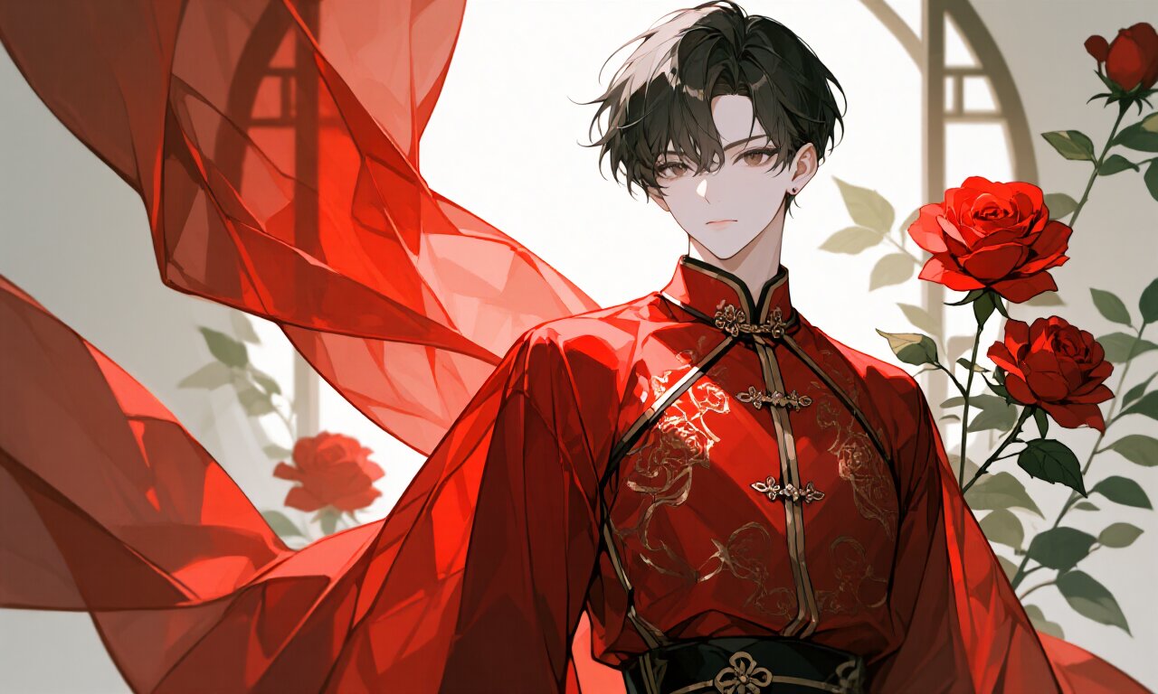 close up face,delicate and elegant young Japanese man, short soft black hair parted slightly to the side, pale skin,brown Clean eyes, calm and thoughtful expression, wearing transparent red china dress,Gold-embroidered Zentangle,side slit,no accessories, modern and slightly casual but refined look, standing straight, full body, front-facing pose, soft shadow, anime style, high detail, clean line art,background red roses, Anime-realistic illustration, high-definition, ultra-detail, polished shading, perfect symmetry, cinematic soft light, elegant aesthetic, refined beauty. ultra-detailed fabric, fine embroidery, realistic folds