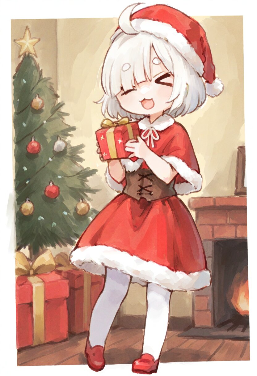<lora:inmnstyleilxl:0.9>, best quality, masterpiece, very aesthetic, watercolor painting, general, 1girl, chibi, solo, Christmas party, red capelet, fur trimmed capelet, brown lac-up corset, red flare skirt, fur trimmed skirt, white tights, red santa hat, holding yellow gift box, (bright white hair), short hair, blunt bangs, white thick eyebrow, white colored eyelashes, (hair over one eye), ahoge, closed eyes, :3, open mouth, <lora:hotarueye_xl_comic01_v20_ill:1>