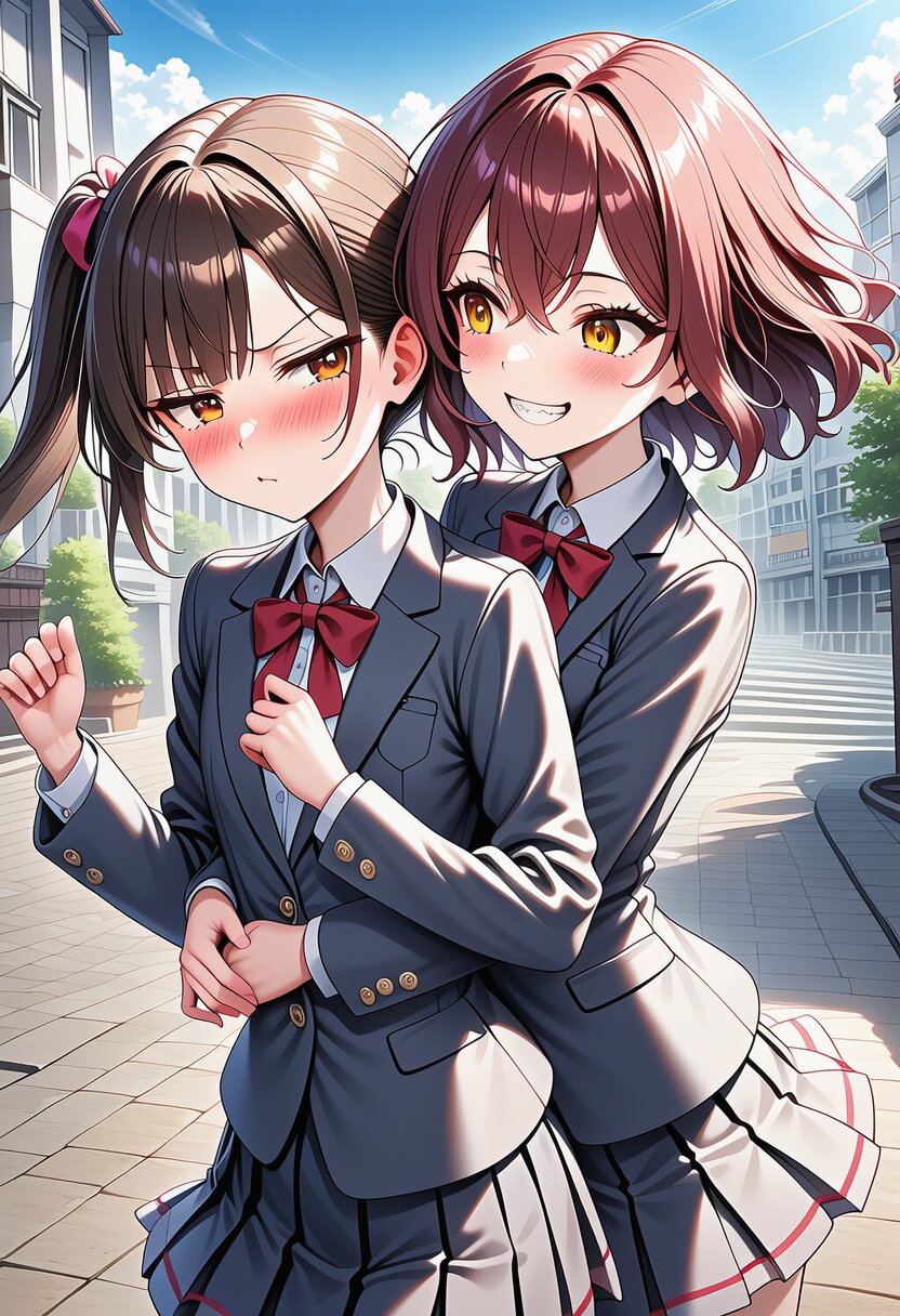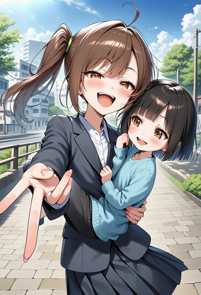 ai-generated, year 2024, anime style, 2girl, mother and child, looking at each other, midday, in modern town, dynamic angle, masterpiece, best quality, ultra detailed, perfect fingers, high resolution, absurdres, perfect anotomy, detailed background, unity 8k wallpaper, location, very aesthetic, masterpiece, no text