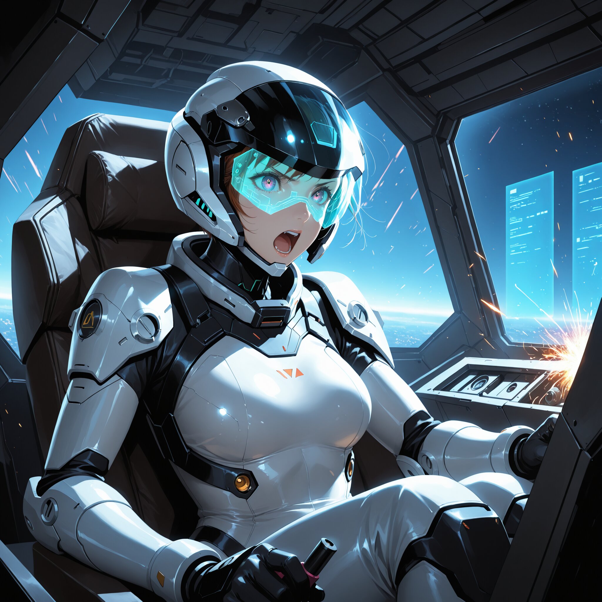 masterpiece, best quality, photorealistic, sharp focus, cinematic lighting, depth of field, beautiful composition, vibrant colors, ultra high res, 8K, highly detailed, masterpiece, best quality, very detailed, Masterpiece, best quality, inside mecha cockpit, 1girl, female pilot, wearing tight sci-fi pilot suit, helmet, holding control sticks, holographic HUD interfaces, glowing screens, intense expression, shouting, view of outer space battle through the panoramic window, giant robot arms visible outside, sparks, intricate mechanical details, cinematic lighting, cyberpunk atmosphere.