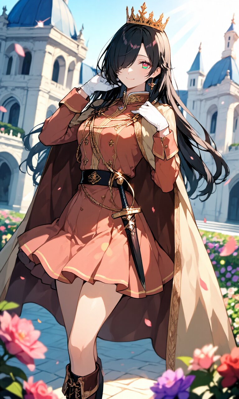 A stunning 35-year-old woman stands alone in a grand palace courtyard, her long black hair cascading elegantly over one eye while delicate bangs frame her beautiful face. Her mesmerizing rainbow eyes shimmer with warmth, accentuated by a gentle smile and cute pose. She wears an exquisite (cornsilk colored luxurious Prince costume:1.6) with long sleeves, paired with a (luxurious dark salmon pink mini skirt:1.4) that flows gracefully. A (luxurious Khaki Cape:1.3) drapes over her shoulders, billowing slightly in the breeze, while (cornsilk colored luxurious Boots:1.3) complete her regal attire. A (dagger on waist:1.3) hints at her noble status, and a (luxurious crown on head:1.4) glimmers atop her head. Her hands are clad in (White luxurious gloves:1.2), adding to her refined elegance. The scene is set against a breathtaking palace with postmodern architecture, surrounded by vibrant flowers bathed in soft afternoon sunlight with sunbeams filtering through the air. The romantic academia atmosphere is enhanced by subtle lens flares and a dreamy, soft lighting that casts a gentle glow on her flawless skin and insanely detailed clothing. Every strand of her delicate hair and fold of her luxurious garments is rendered with masterful precision, creating a masterpiece of beauty and sophistication.