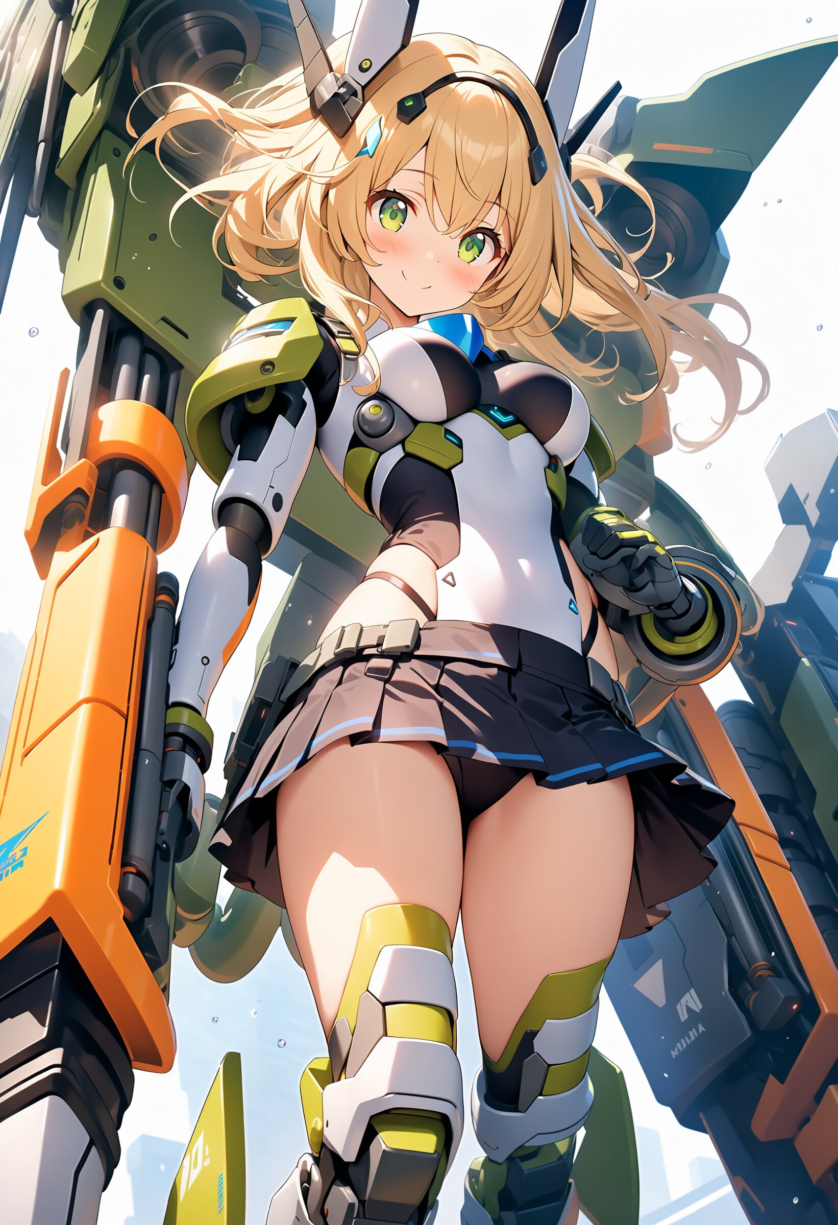 1girl, ((white background)), ultra detailed 8k cg render, masterpiece, high resolution, extremely detailed, mecha musume,mecha shoulder, mech leg, headgear, mecha armor, ((mini skirt)),long blonde hair, dropping green eyes, smile, dynamic posing,