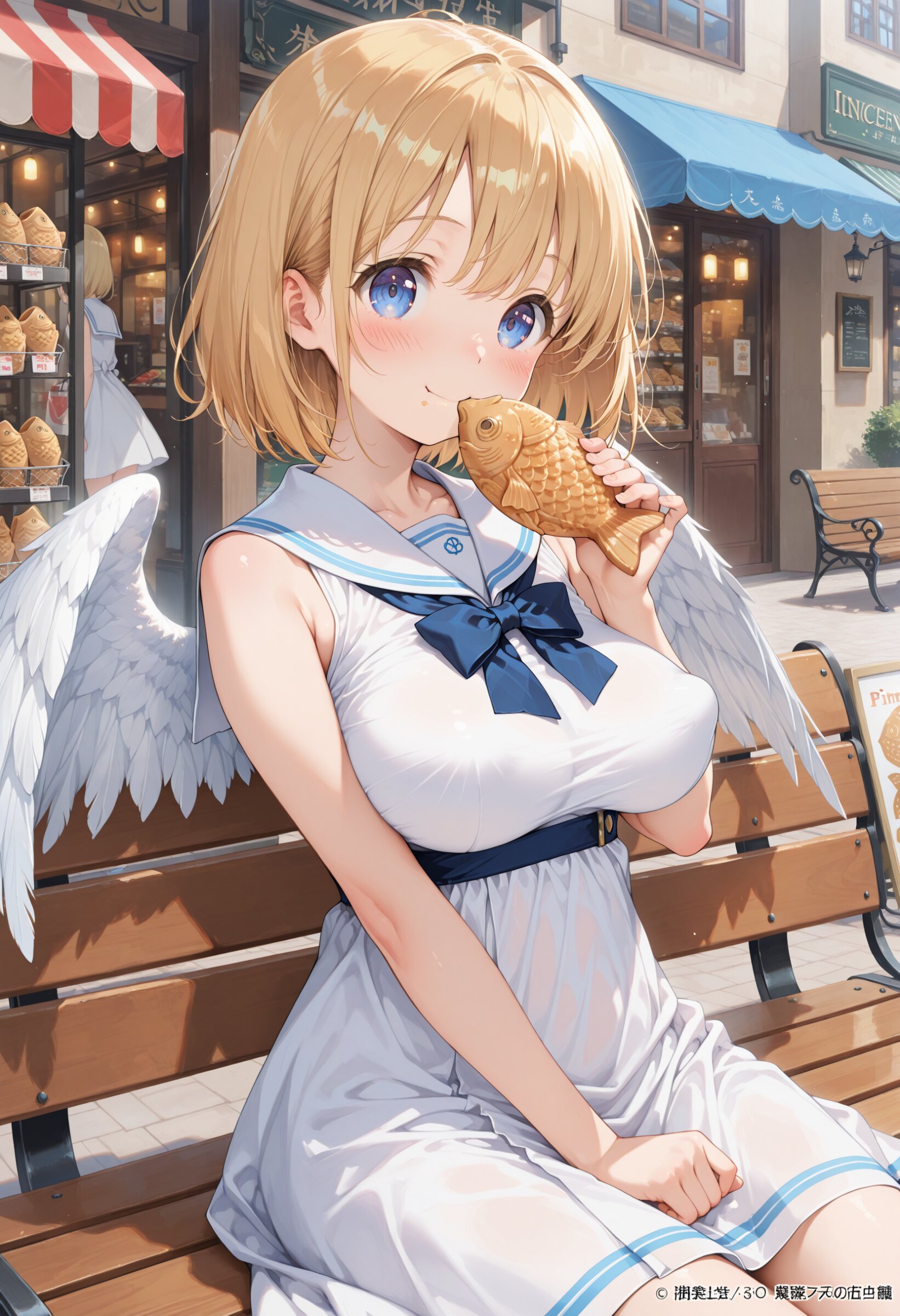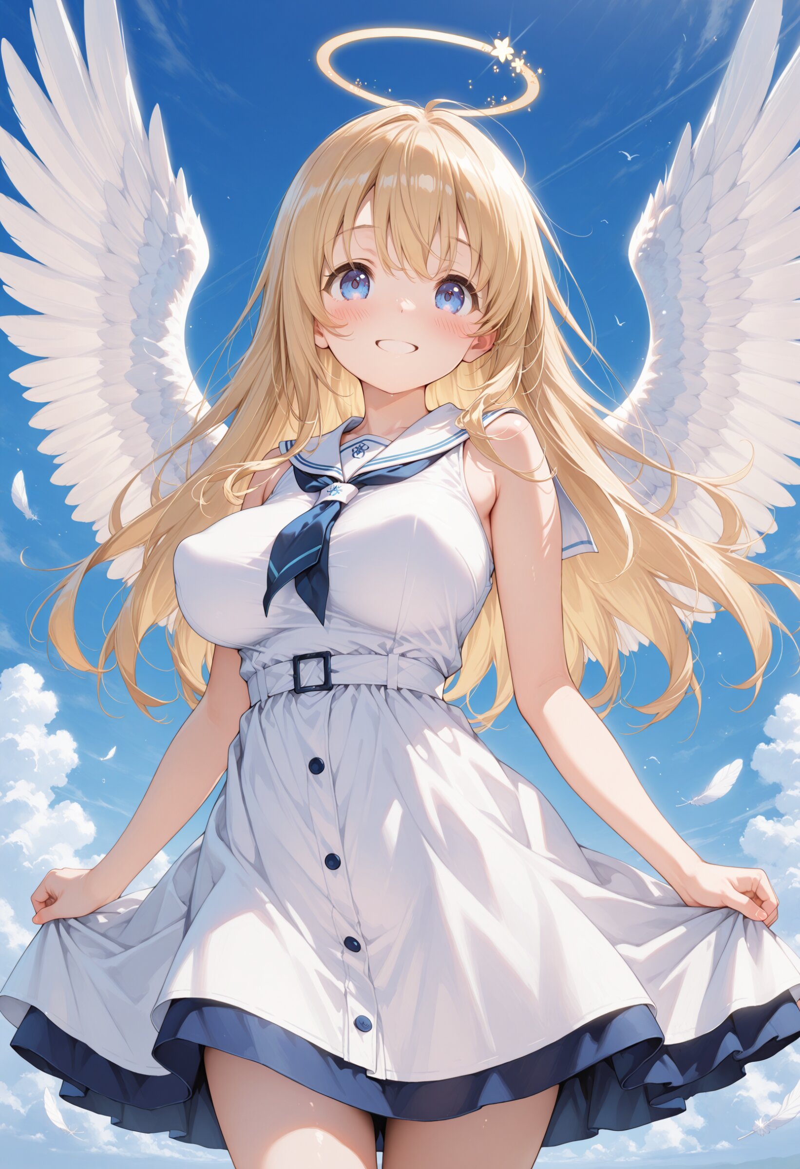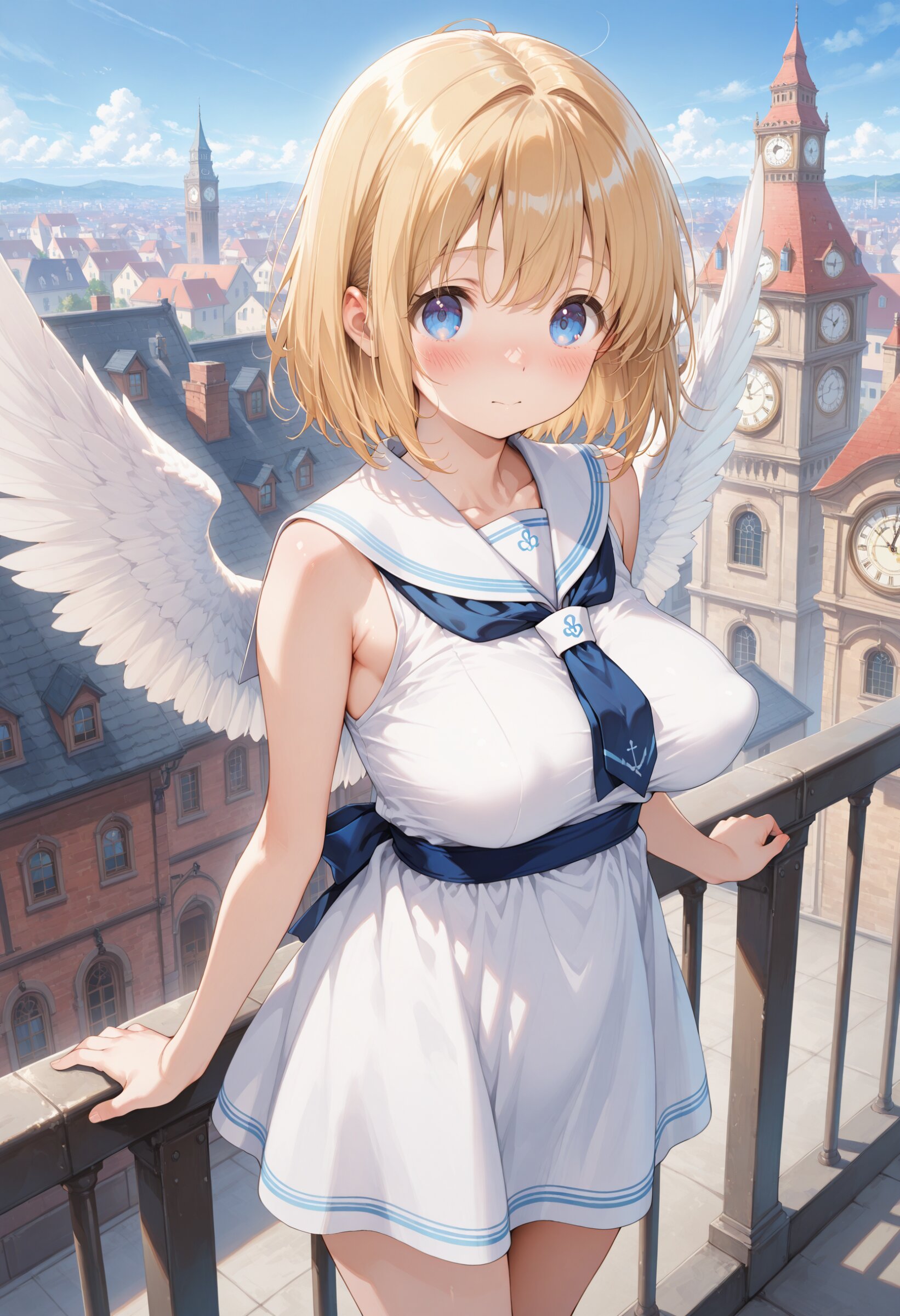 masterpiece, best quality, amazing quality, general, fine detail, official art, 1girl, loli, blonde hair, (white sailor dress:1.2), blue sailor tie, sleeveless, big breasts, (perky breasts:1.2), big white wing, innocent expression, blush, standing, on the rooftop of clock tower,