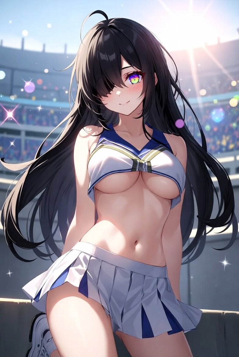 1 woman, middle breasts, solo, long hair, black hair, hair over one eye, bangs, rainbow eyes She wears a modern cheerleader uniform, including a crop top showing her navel, a pleated miniskirt, and white sneakers, with a blush on her cheeks. The background is an outdoor stadium with bright sunlight, glitter effects,