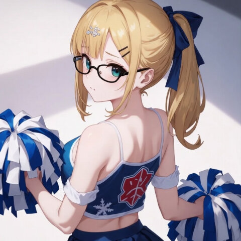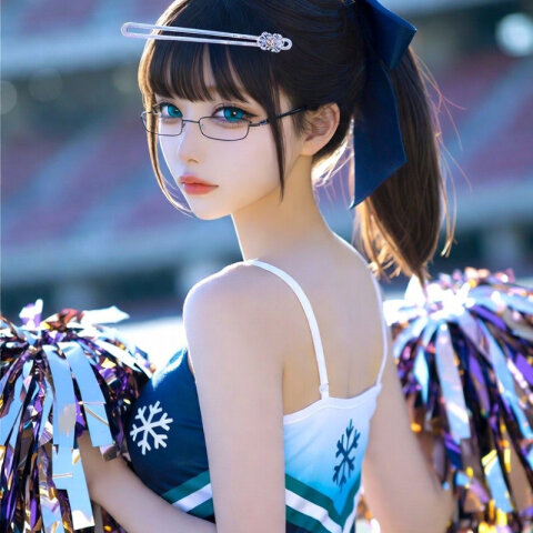 (dark skin:1.2), orange hair, ponytail, orange eye, large breasts, black-framed eyewear, tactical maid, white waist apron, mechanical arms, doll joints,mechanical legs. She wears a modern cheerleader uniform, including a crop top showing her navel, a pleated miniskirt, and white sneakers, with a blush on her cheeks. The background is an outdoor stadium with bright sunlight, glitter effects,