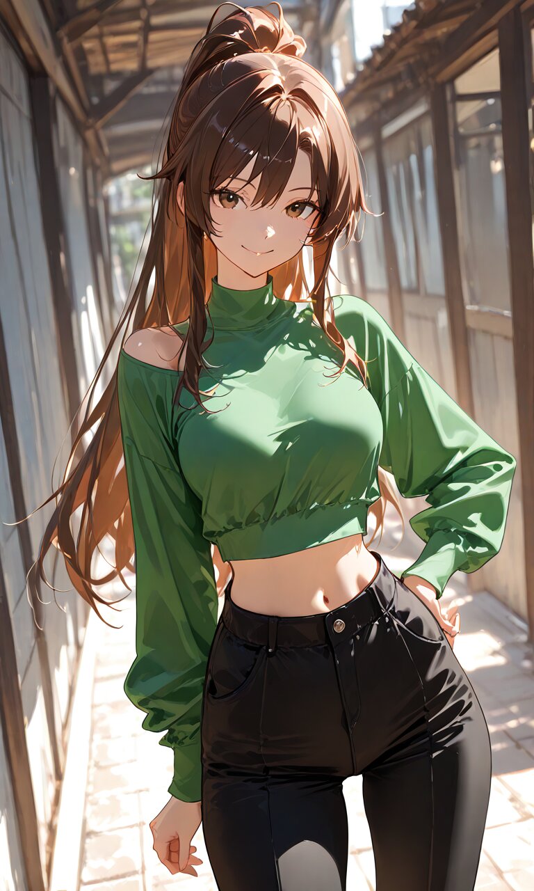 (best quality),(masterpiece),(ultra detailed),1 lady, long ponytail, brown hair, smile, breasts, green shirt, long sleeves, off shoulder, navel, black pants, cowboy shot