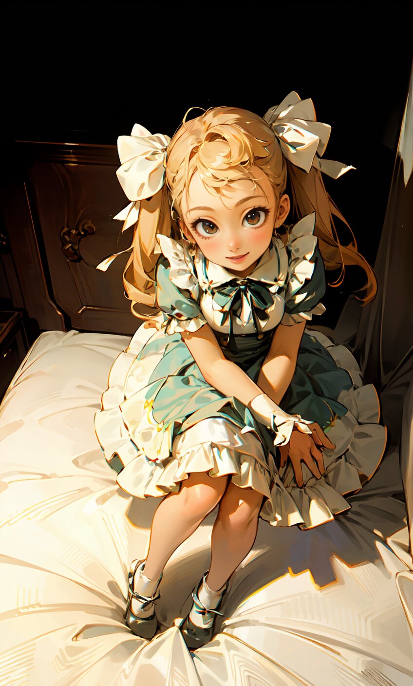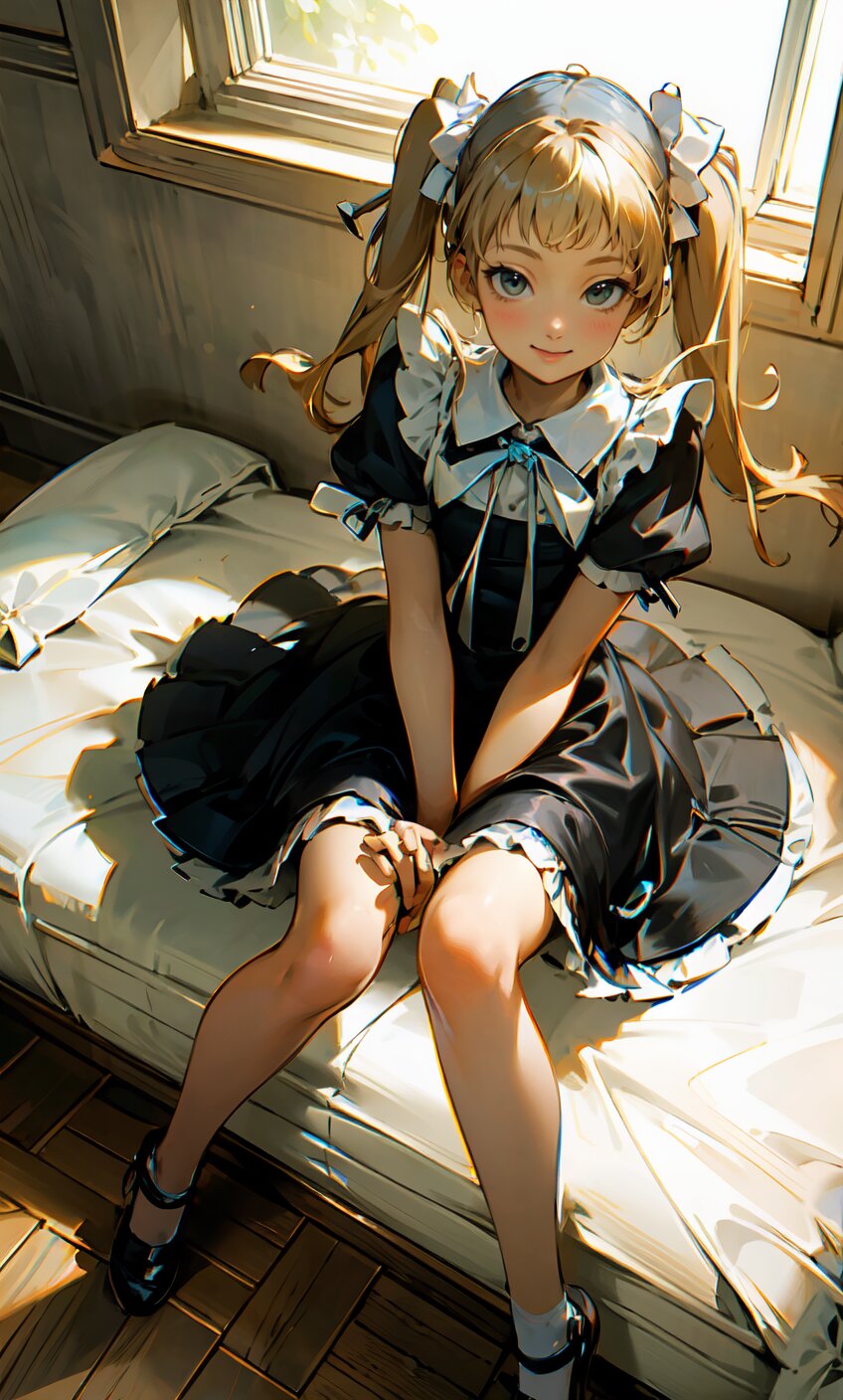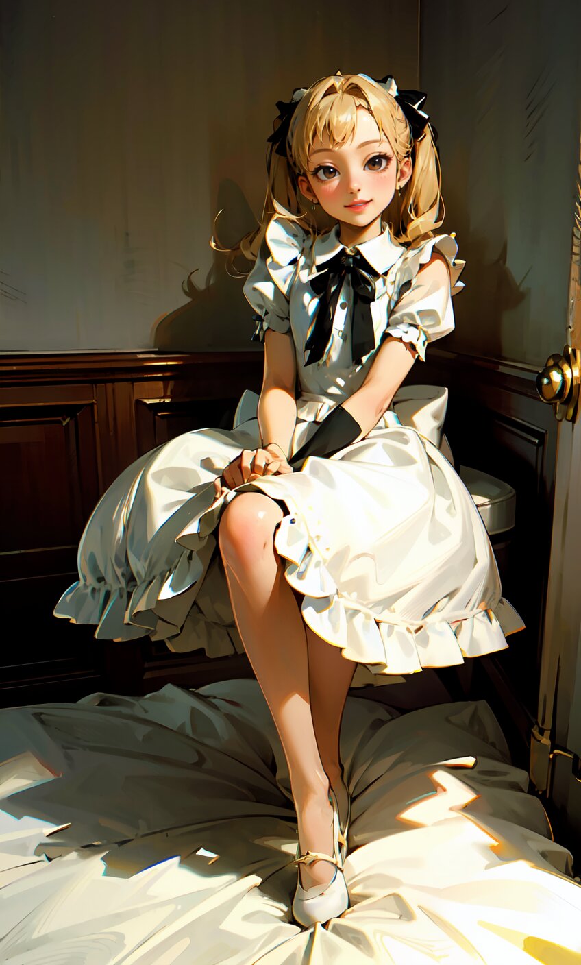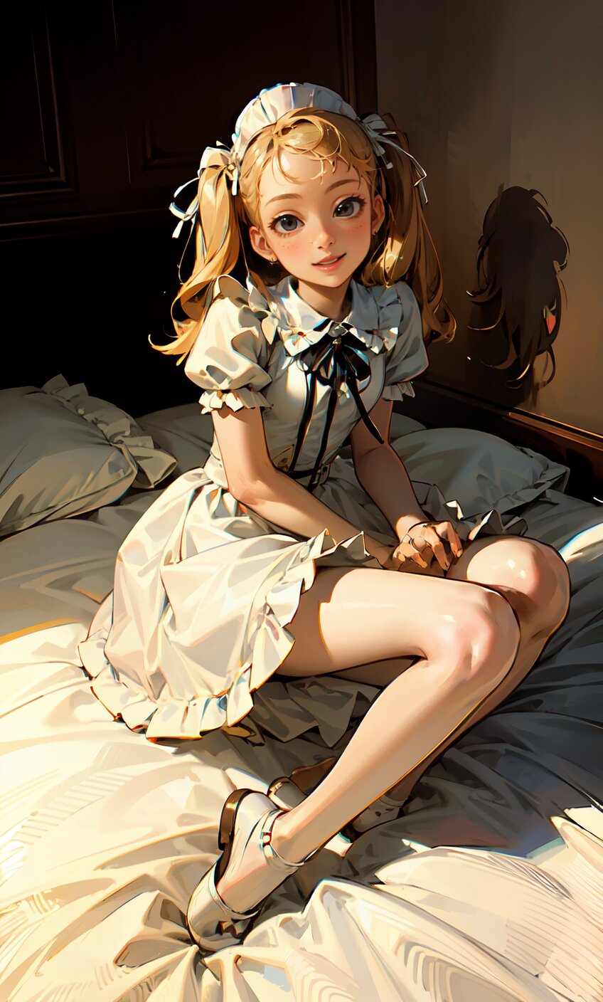 perfect anatomy, (8k, best quality, masterpiece:1.2), (realistic, photo-realistic:1.37), ultra-detailed, 1girl, 10 years old, maid, short sleeve white maid uniform, (full body: 1.2), {{magical girl}}, (lolita: 1.8), (beautiful detailed face: 1), blond hair, twintails, looking at viewer, dark hair, dark eyes, (an extremely delicate and beautiful hands), sitting on bed, <lora:Valensiya_v01:0.8>
