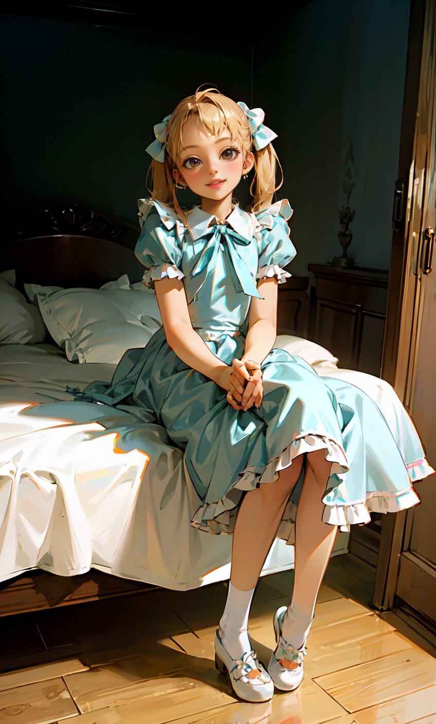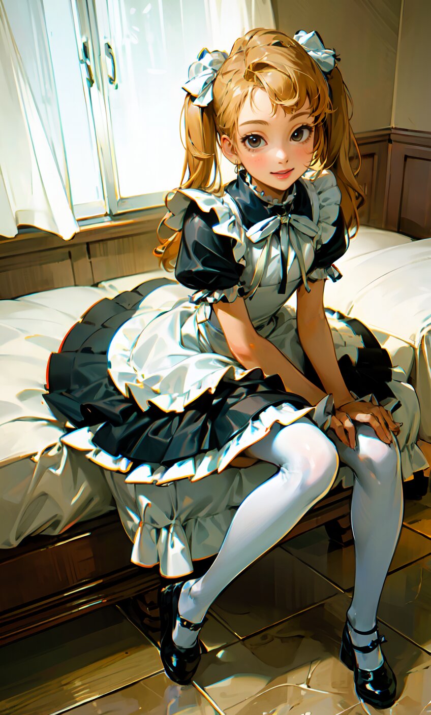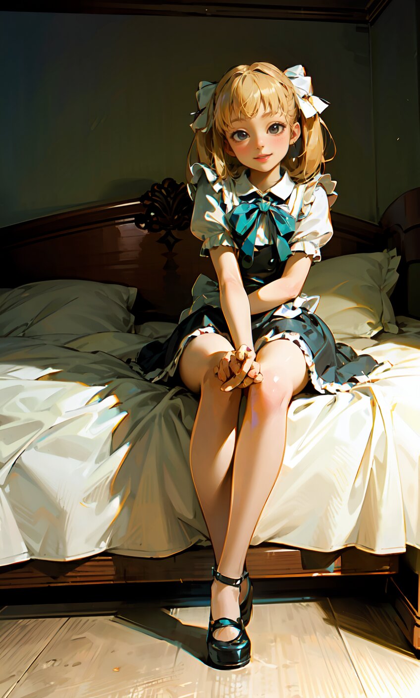 perfect anatomy, (8k, best quality, masterpiece:1.2), (realistic, photo-realistic:1.37), ultra-detailed, 1girl, 10 years old, maid, short sleeve white maid uniform, (full body: 1.2), {{magical girl}}, (lolita: 1.8), (beautiful detailed face: 1), blond hair, twintails, looking at viewer, dark hair, dark eyes, (an extremely delicate and beautiful hands), sitting on bed, <lora:Valensiya_v01:0.8>