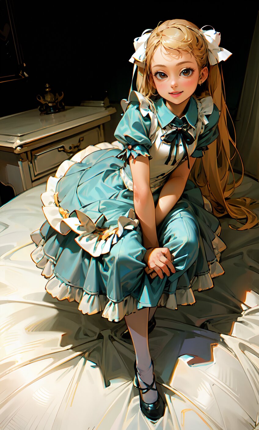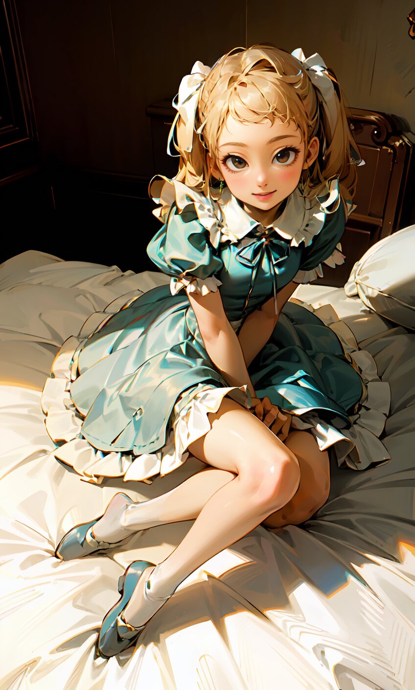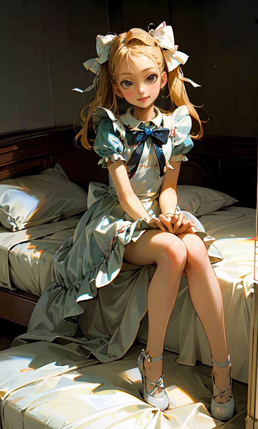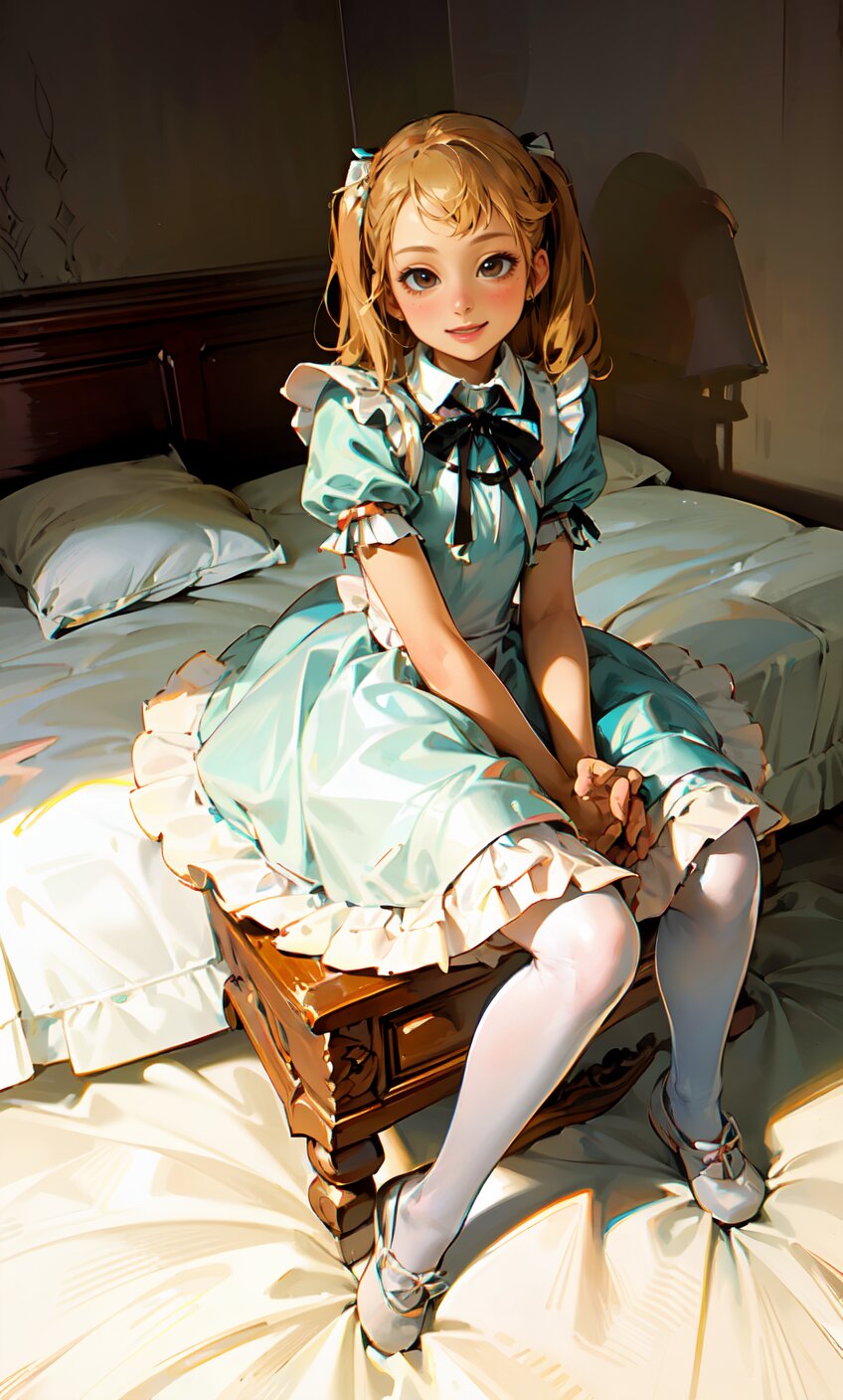perfect anatomy, (8k, best quality, masterpiece:1.2), (realistic, photo-realistic:1.37), ultra-detailed, 1girl, 10 years old, maid, short sleeve white maid uniform, (full body: 1.2), {{magical girl}}, (lolita: 1.8), (beautiful detailed face: 1), blond hair, twintails, looking at viewer, dark hair, dark eyes, (an extremely delicate and beautiful hands), sitting on bed, <lora:Valensiya_v01:0.8>
