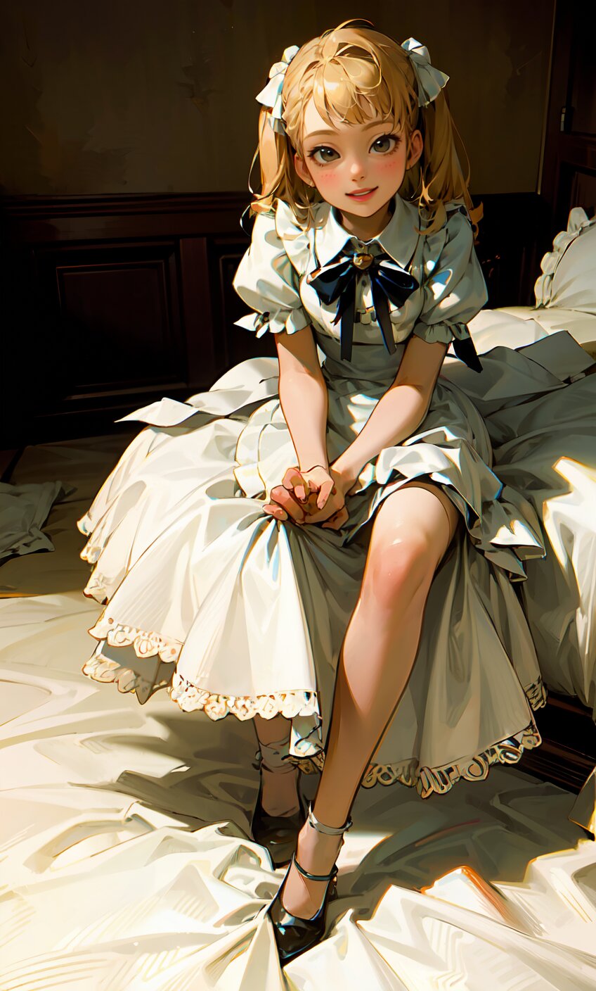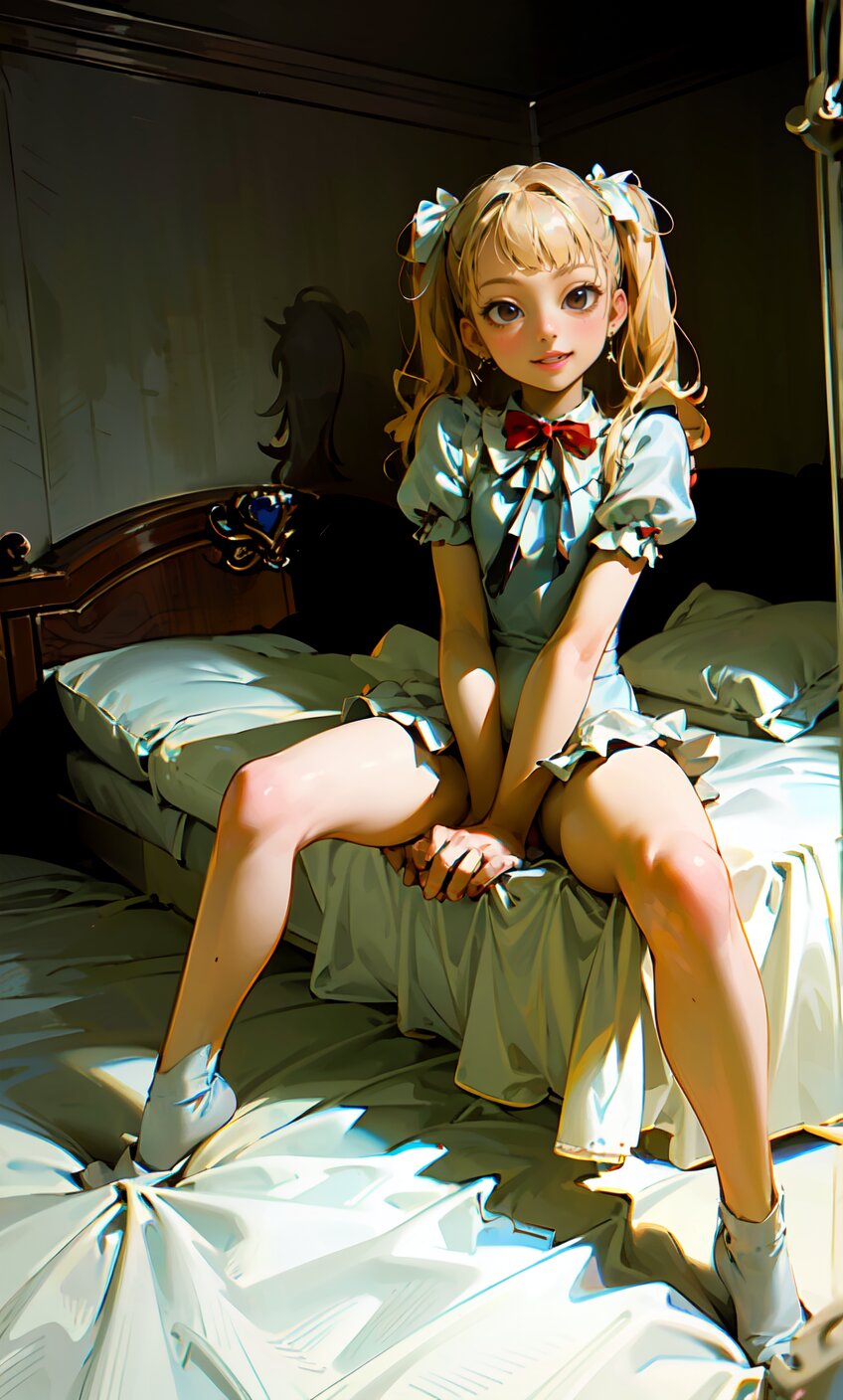 perfect anatomy, (8k, best quality, masterpiece:1.2), (realistic, photo-realistic:1.37), ultra-detailed, 1girl, 10 years old, maid, short sleeve white maid uniform, (full body: 1.2), {{magical girl}}, (lolita: 1.8), (beautiful detailed face: 1), blond hair, twintails, looking at viewer, dark hair, dark eyes, (an extremely delicate and beautiful hands), (sitting on bed, wide spreading legs: 1.6), <lora:Valensiya_v01:0.8>