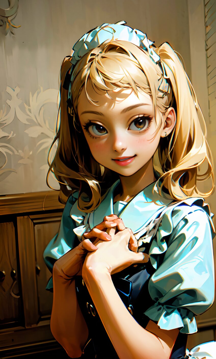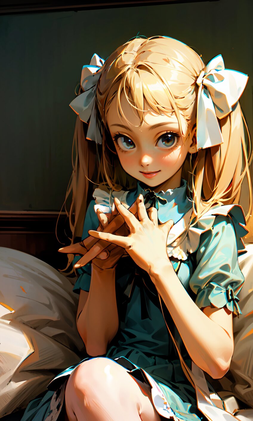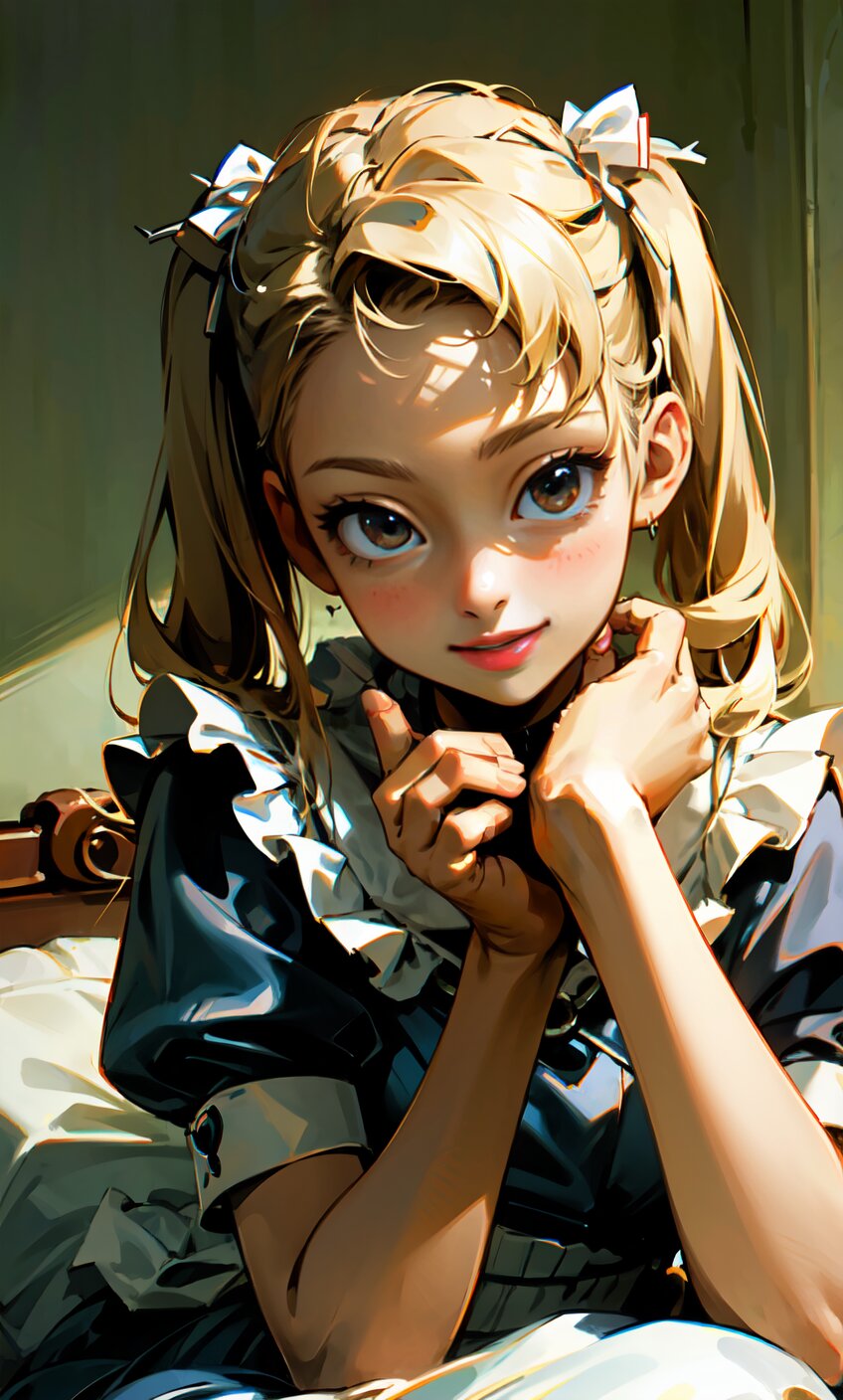 perfect anatomy, (8k, best quality, masterpiece:1.2), (realistic, photo-realistic:1.37), ultra-detailed, 1girl, 10 years old, maid, short sleeve white maid uniform, (full body: 1.2), {{magical girl}}, (lolita: 1.8), (beautiful detailed face: 1), blond hair, twintails, looking at viewer, dark hair, dark eyes, (an extremely delicate and beautiful hands), (sitting on bed, wide spreading legs: 1.6), <lora:Valensiya_v01:0.8>