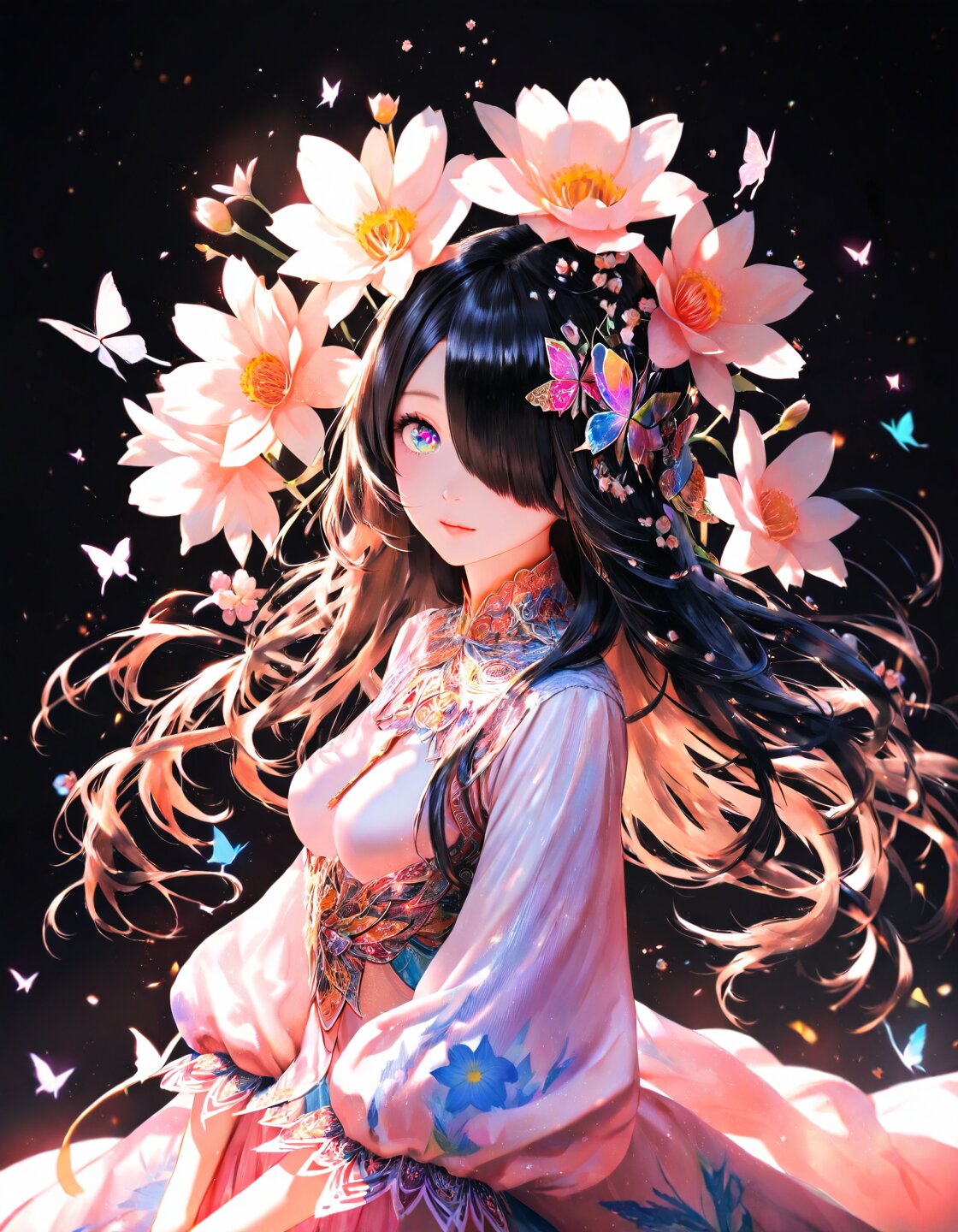 solo,1girl,35 years old,1 woman, middle breasts, solo, long hair, black hair, hair over one eye, bangs, rainbow eyes, delicate face, detailed face, detailed skin, fair skin,masterpiece, best quality, insanely detailed, highly detailed, intricate, detailed eyes, beautiful eyes, beautiful face, beautiful hair, beautiful, 16k, photorealistic,hair ornament,beautiful�detailed�flower,beautiful�detailed�eyes,hyper�detailed,flower,hyper�quality,flower�and�hair�is�same�color,beautifuly�color,face,hair�is�becoming�flower,hair,butterfly,kawaii,back�light,hair�and�clothes�is�flower,webbed�dress,flower�leg,flower�hands,body�with�flower,flower�with�clothes,dress�with�flower,light�particles,black�background,Hair�with�flower,breast�with�flower,floating�hair�with�flower,marbling�with�hair�and�clothes,looking�at�viewer,paper�cutting,flower�forground,�diffusion�lighting,abstract,Butterfly�with��body,big�top�sleeves,floating,hazy atmosphere,dreamy atmosphere, art academia, fairy academia, mystical atmosphere, fantasy,side view