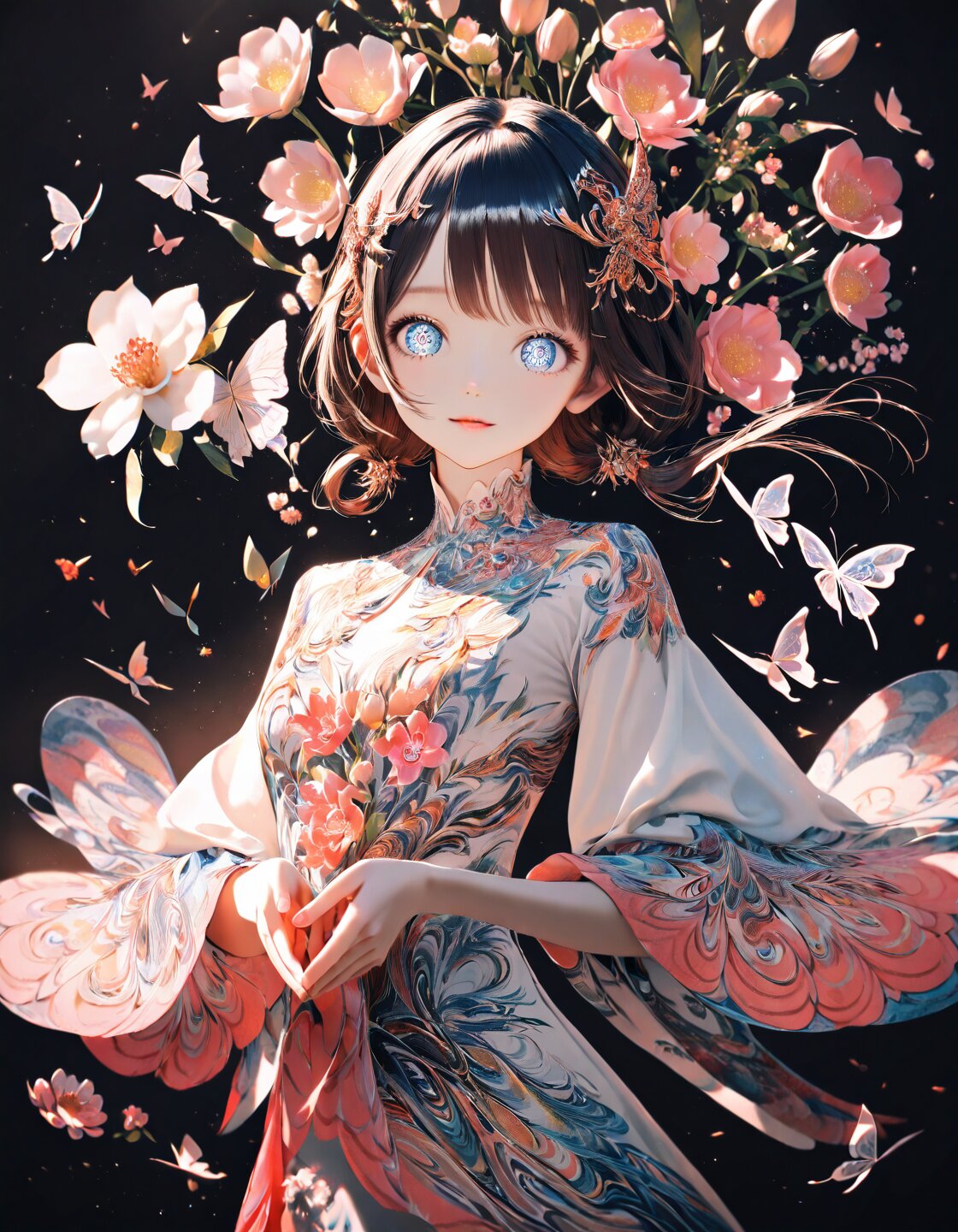 solo,1girl,16 years old,brown short hair,low twintail,dark blue eyes, delicate face, detailed face, detailed skin, fair skin,masterpiece, best quality, insanely detailed, highly detailed, intricate, detailed eyes, beautiful eyes, beautiful face, beautiful hair, beautiful, 16k, photorealistic,hair ornament,beautiful�detailed�flower,beautiful�detailed�eyes,hyper�detailed,flower,hyper�quality,flower�and�hair�is�same�color,beautifuly�color,face,hair�is�becoming�flower,hair,butterfly,kawaii,back�light,hair�and�clothes�is�flower,webbed�dress,flower�leg,flower�hands,body�with�flower,flower�with�clothes,dress�with�flower,light�particles,black�background,Hair�with�flower,breast�with�flower,floating�hair�with�flower,marbling�with�hair�and�clothes,looking�at�viewer,paper�cutting,flower�forground,�diffusion�lighting,abstract,Butterfly�with��body,big�top�sleeves,floating,hazy atmosphere,dreamy atmosphere, art academia, fairy academia, mystical atmosphere, fantasy,side view