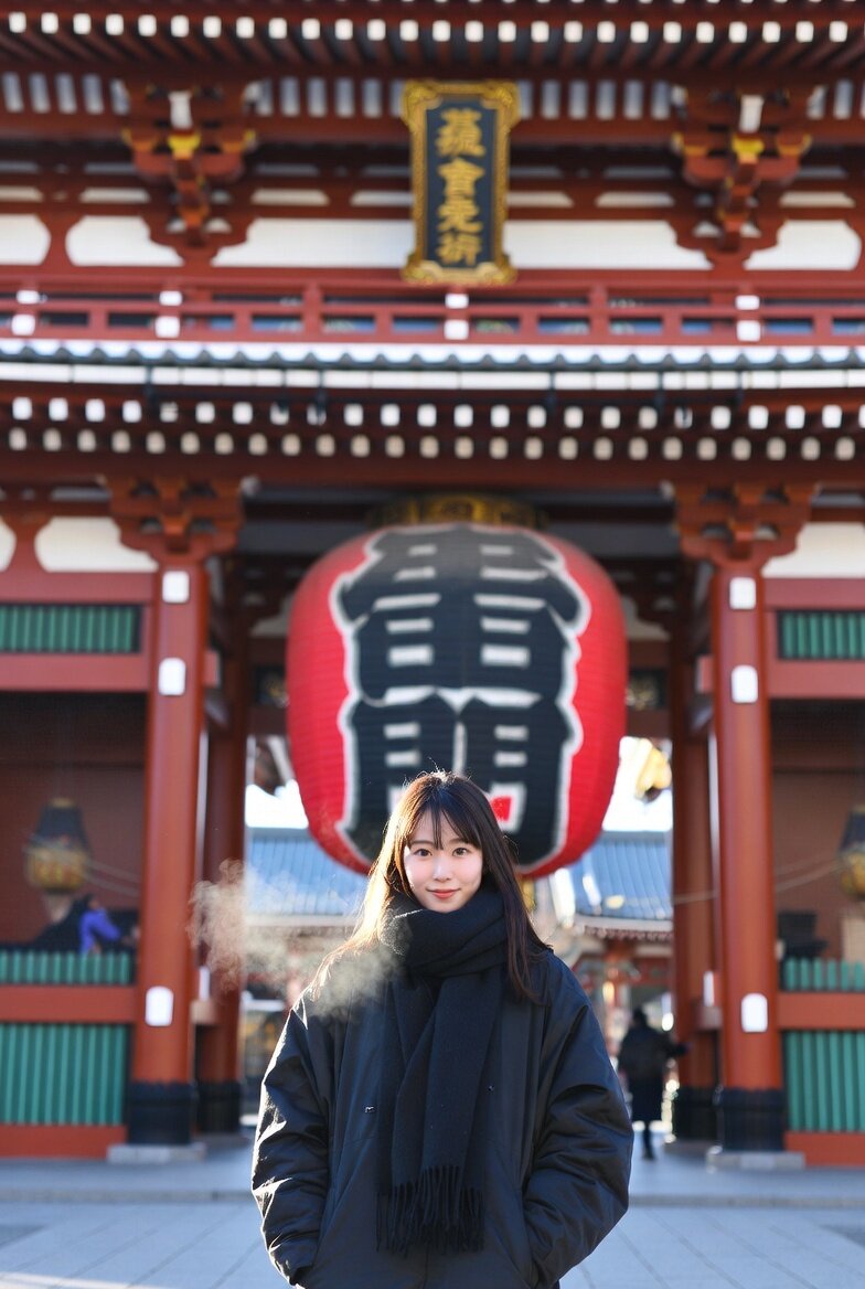 A photo taken in front of Asakusa Kaminarimon. A 24-year-old Japanese woman wearing a winter coat and scarf, posing for a tourist memorial photo, looking at the camera.