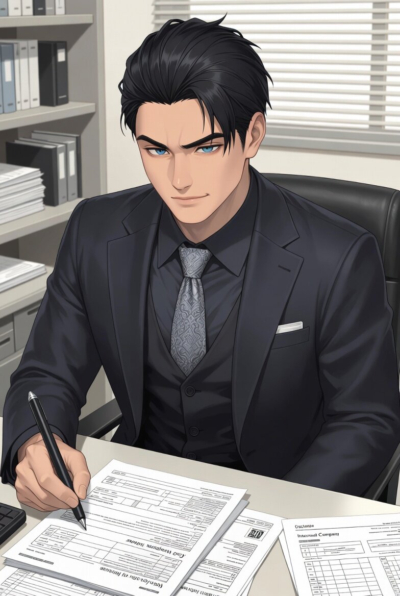 イラスト。年末で書類仕事が忙しい社長室の様子。デスクには兵器ビジネスのカタログと契約書や、社内の稟議書。背景はとても整然と整頓されている社長室。一人で執務にあたるA stylish Asian man in his thirties with distinctive facial features, including jet-black hair at the back of his head and a strong jawline. His captivating blue eyes are narrowed sharply, conveying a deliberately intense expression. His physique is broad-shouldered and muscular. He wears a perfectly tailored black suit, paired with a matching black vest and a gray patterned tie. The suit fabric appears smooth, accentuating its refined silhouette.