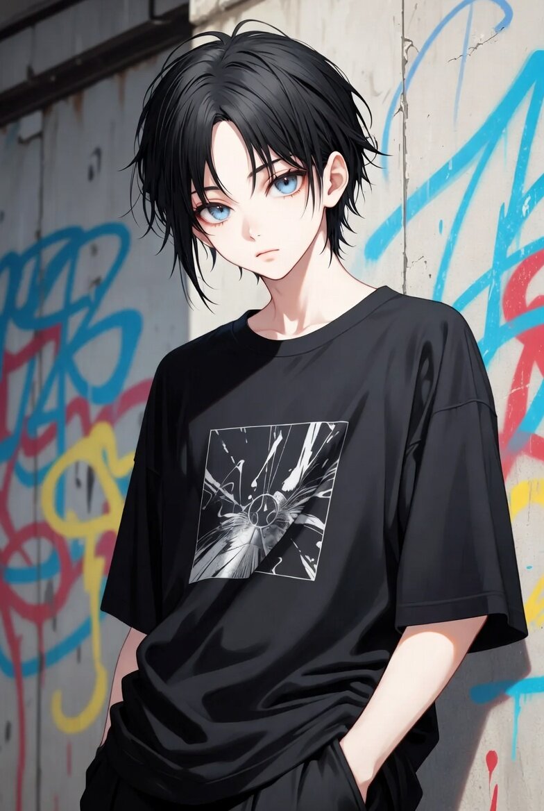 アニメスタイルの若い少年、短い乱れた黒髪、髪型は2つに分かれていておでこが見えている、鮮やかな青い目、色白の肌、少し憂いのある中性的な表情。カジュアルな雑誌モデルのようなポーズ。黒いオーバーサイズの長袖Tシャツを着て、胸元にキャラクターが描かれている。黒いパンツ。背景は、スプレーで落書きされたビルの壁。柔らかい照明、傑作、目が詳細。