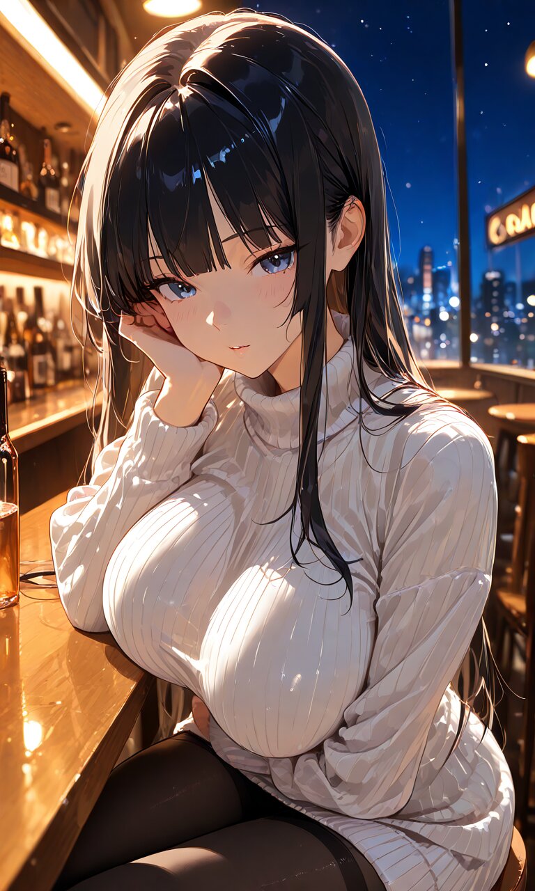 (best quality),(masterpiece),(ultra detailed),1 lady, long hair, black hair, blunt bangs, big breasts, white sweater, black pantyhose, night, sitting, bar, cool