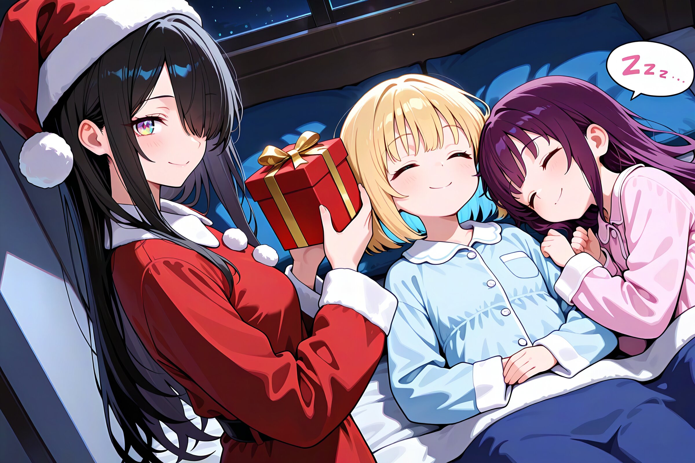 1 woman, solo, diagonal angle, from side, upper body, masterpiece, best quality, amazing quality, very aesthetic, closed, smile, elegant, long hair, black hair, hair over one eye, bangs, rainbow eyes, small breasts, santa costume, santa hat, night, standing by bed, holding gift, BREAK 2 little girls, diagonal angle, masterpiece, best quality, amazing quality, very aesthetic, bob cut, blonde hair, light blue Inner hair color, sleeping, closed eyes, closed mouth, smile, cheerful, zzz, spoken zzz, cute pajamas, night, sleeping on bed, BREAK 2 little girls, diagonal angle, masterpiece, best quality, amazing quality, very aesthetic, purple hair, sleeping, closed eyes, closed mouth, smile, cheerful, zzz, spoken zzz, cute pajamas, night, sleeping on bed,