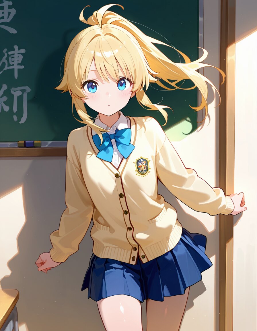 1girl,(young girl),small body,beautiful face and eyes,Beautiful,clear,curious blue eyes,Beautiful hair,floating hair,shoulder length hair,(blonde hair),bobbed hair with ponytail,antenna hair,ahoge,pretty,(flat chest),(small breasts),active personality,cowboy shot,dynamic pose,action painting,school uniform,long sleeve shirt,cardigan,, (best quality,masterpiece:1.4),(high resolution,super fine illustration:1.36),shiny skin,finely,detailed face,japaneese idol