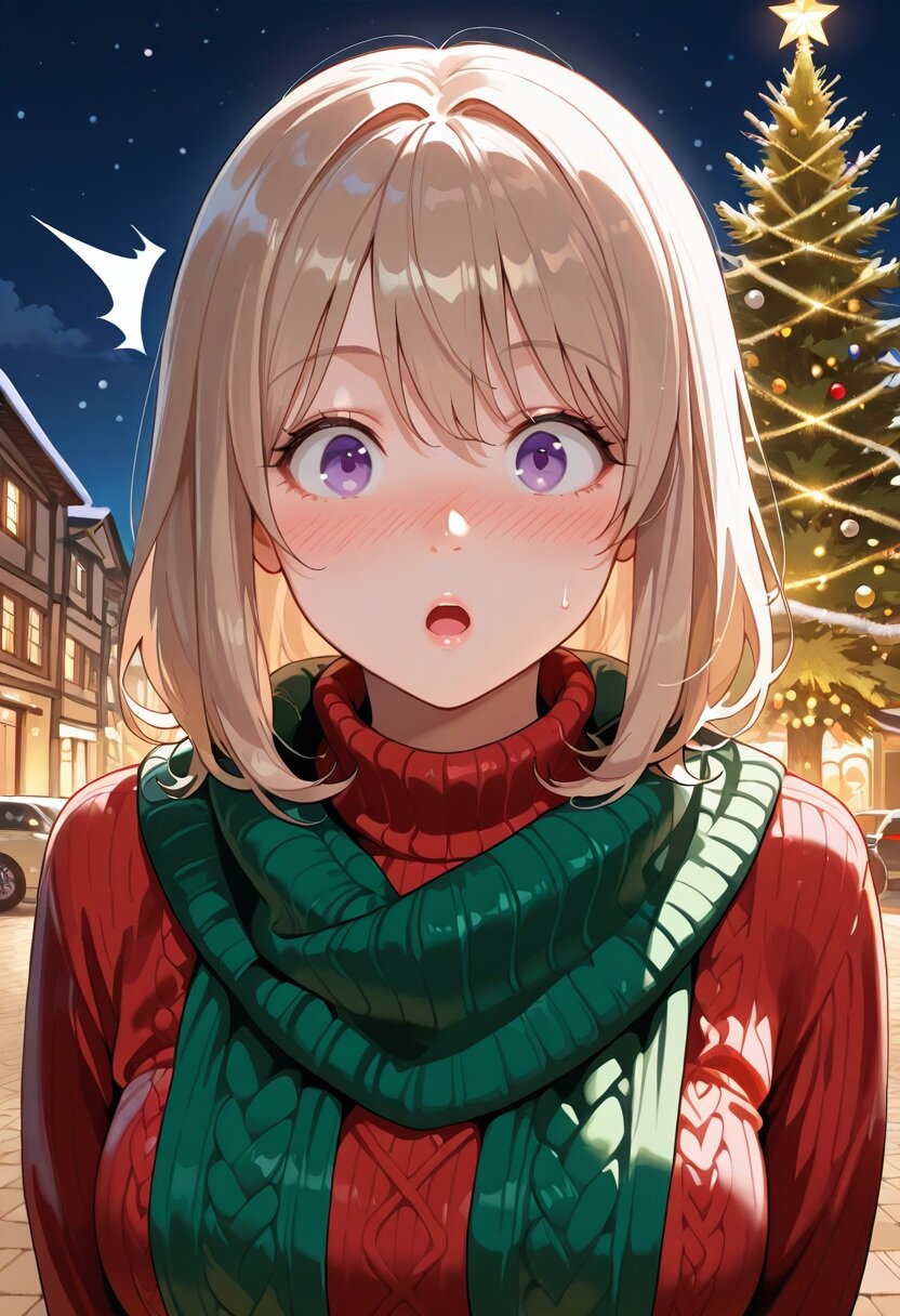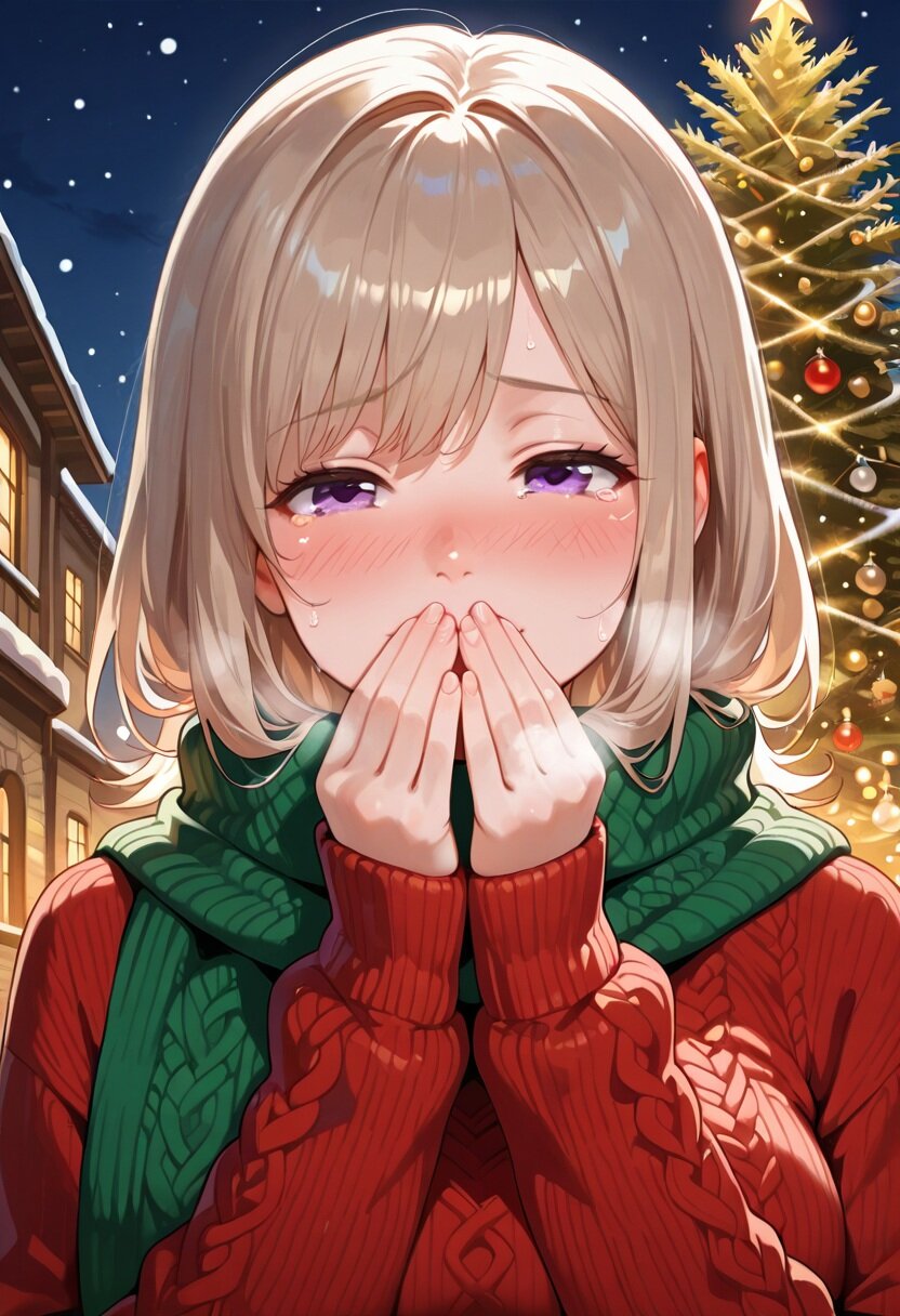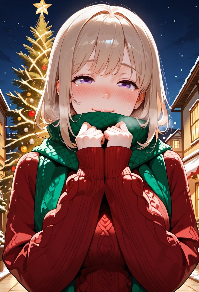 masterpiece, best quality, very aesthetic, absurdres, highres,sharp focus, HD,(detailed background,realistic background:1.25), back lighting,,tranquil, chill,clear air, night, outdoors, town,christmas, christmas tree, upper body, face close-up, BREAK 1girl, solo, (young,adult, 20 yo), cute, perfect body, detailed face, detailed skin, light brown hair, purple eyes,(large eyes, round eyes:1.2),tareme, (detailed eyes), half-closed eyes,nostrils, medium hair, curl outward hair, medium breasts, (happy:1.3),nose blush, covering own mouth,teary eyes knit sweater,red sweater,green knit scarf,