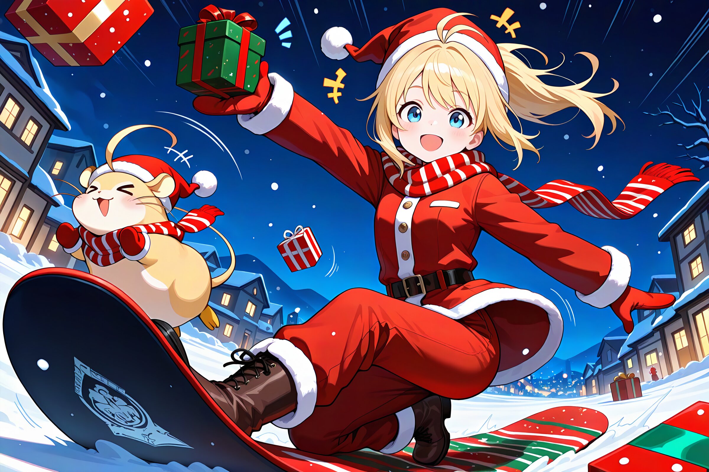 1 little girl solo, diagonal angle, masterpiece, best quality, amazing quality, very aesthetic, small body, beautiful face and eyes, Beautiful, clear, curious blue eyes, Beautiful hair, floating hair, shoulder length hair, (blonde hair), bobbed hair with ponytail, antenna hair, ahoge, pretty, (flat chest), (small breasts), active personality, open mouth, smile, cheerful, +++, notice lines, santa costume, santa hat, red mittens, red pants, hamsters on her headwear, > <, snowboarding, holding gift box, christmas, night, snow, stacked gift boxes, pile of christmas presents, tied with ribbon, colorful wrapping paper, balancing gifts, unstable stack, dynamic pose, speed lines, motion lines, wind blowing, winter clothes, santa hat, red coat, scarf, boots, gloves, city street, town background, dynamic composition,