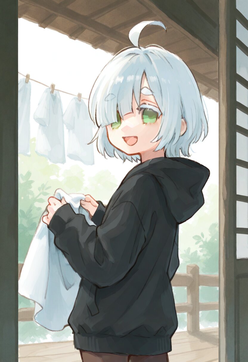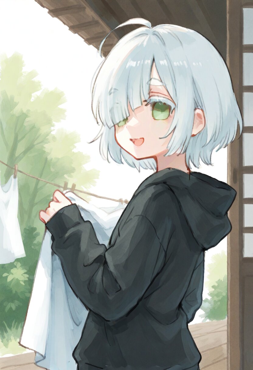 <lora:inmnstyleilxl:0.9>, ultra-detailed, best quality, masterpiece, very aesthetic, watercolor painting, general, 1girl, chibi, solo, veranda, clothesline, holding sheets, sunlight, look back, smile, open mouth, upper body, (bright white hair), short hair, blunt bangs, white thick eyebrow, white colored eyelashes, (hair over one eye), ahoge, mintgreen eyes, oversize black hoodie, sleeves past wrists, brown tights