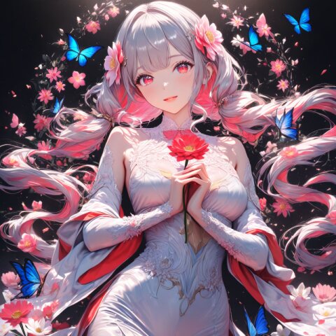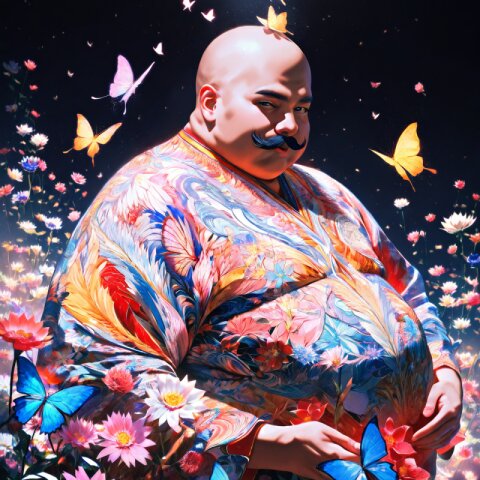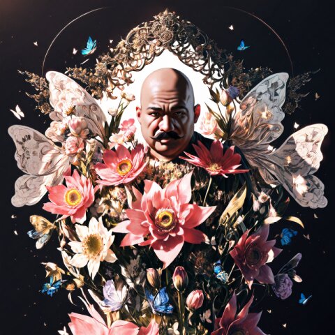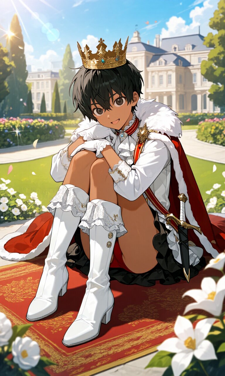 a 16-year-old boy with short black hair that reaches his neck, featuring hair between his eyes, big dark brown eyes, and (tan skin). He has a (wiry) and (athletic) build, with a detailed face, skin, hair, and clothes. He wears a (luxurious White Prince costume:1.6) with long sleeves, a (Red luxurious Cape:1.3), a (Black luxurious mini skirt:1.4), a red panty, and (White luxurious boots:1.3). He has a (dagger on waist:1.3), a (luxurious crown on head:1.3), and (White luxurious gloves:1.2). He sits on a luxurious square carpet on the ground with his knees up, looking directly at the viewer with a cute, cheerful face and a gentle smile. The setting is outside a palace with Rococo architecture, (in the flower garden:1.5), in the afternoon with a blue sky, calm atmosphere, and classic romantic academia style. The scene includes lens flare, sunlight, sunbeam, and shining lights, creating a serene and picturesque environment. The image is a masterpiece with best quality, insanely detailed, beautiful, and 16k resolution, with a (full body, strong focus on face and upper body:1.3).