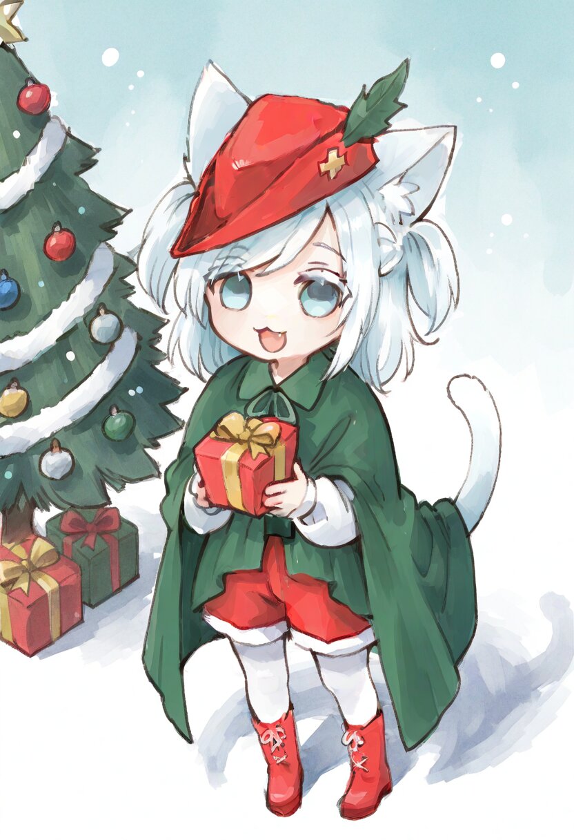 <lora:inmnstyleilxl:0.9>, ultra-detailed, best quality, masterpiece, very aesthetic, watercolor painting, general, 1boy, chibi, solo, red tricorne, white blouse, long sleeves, puffy sleeves, green cloak, red shorts, white tights, red boots, holding gift box, Christmas tree, from above, white hair, two side up, medium hair, braid bangs, swept bangs, pale blue eyes, white colored eyelashes, :3, fang, cat ears, cat tail, smile, open mouth, looking at viewer