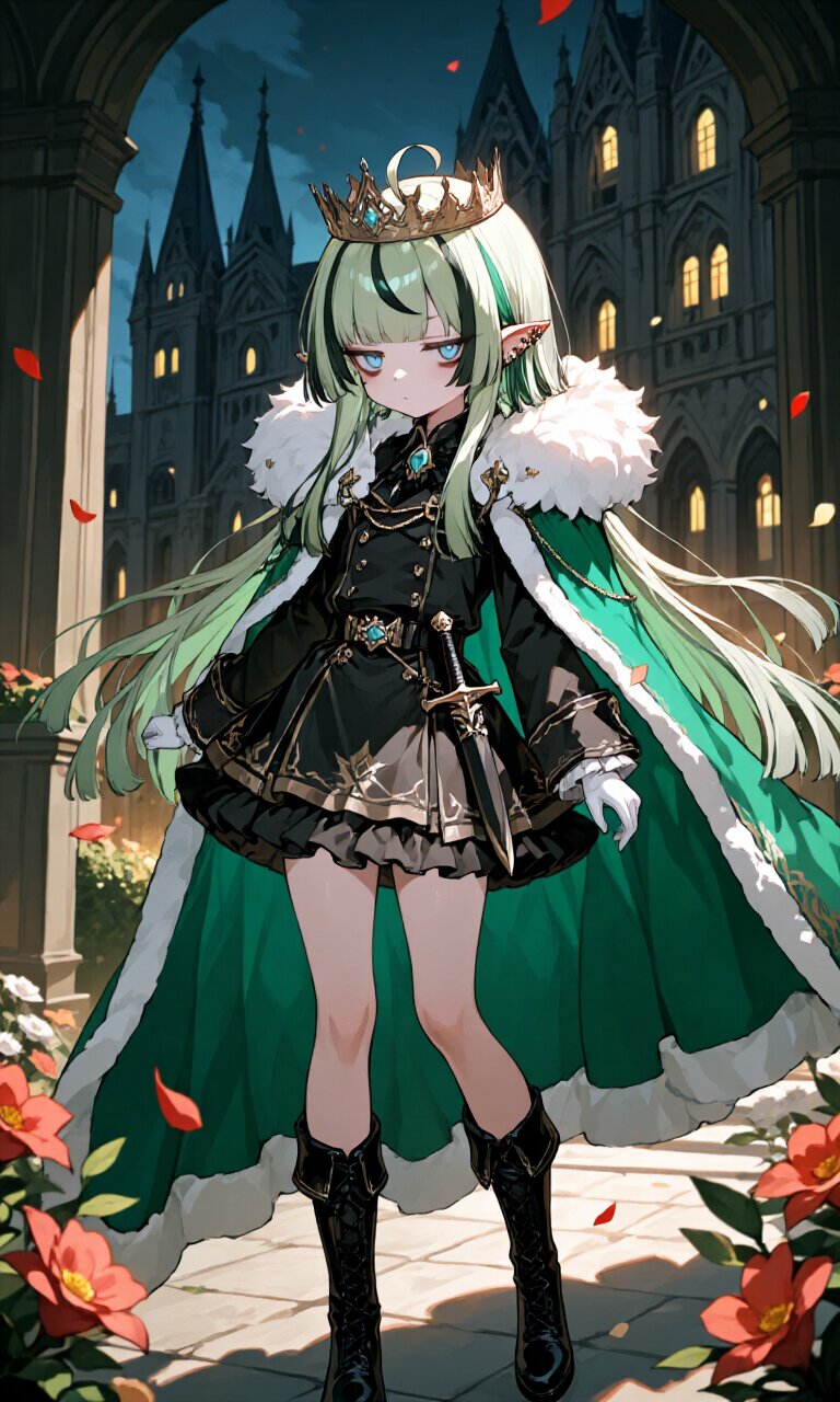 1girl, a 20-year-old elf with Light Green hair and (Dark Green highlights streaked hair:1.2) in a long, straight hime cut with blunt bangs and an ahoge. She has piercing Blue eyes with bags under them and a jitome expression, fair skin, and a flat-chested figure. Her face is beautiful and delicate with a detailed, expressionless visage. She wears a (Black luxurious Prince costume:1.6) with long sleeves, a (luxurious Green Cape:1.3), a (luxurious mini skirt with frills:1.4), (Black luxurious Boots:1.3), a (dagger on waist:1.3), a (luxurious crown on head:1.4), and (White luxurious gloves:1.2). She has many piercings, including on her ears and face. She stands in a pose that is both cute and commanding, outside a Palace with Gothic architecture at night, surrounded by flowers and dramatic lighting that casts deep shadows and highlights her features. The atmosphere is romantic academia, with a sense of darkness and mystery. The style is insanely detailed and polished, with a focus on intricate textures and a masterpiece quality.