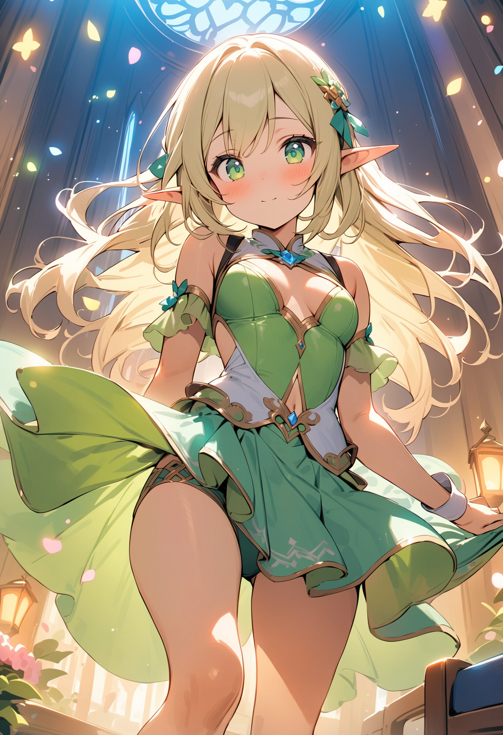 ((masterpiece)), ((best quality)), ((kawaii)), cute, (lovely), ((extremely detailed)), (beautiful), dynamic angle, a cute girl, 1girl, solo, ((elf )),beautiful blond hair, beautiful green eyes, ((beautiful eyes)), long hair, fantasy clothes,